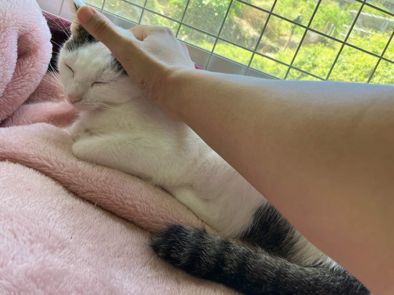 捕獲時に捕獲機に尻尾が挟まってしまい、自然に尻尾が取れて少し短くなってしまいましたが、支障はないとの事です。逆にその短くなった尻尾が可愛く見えています。