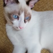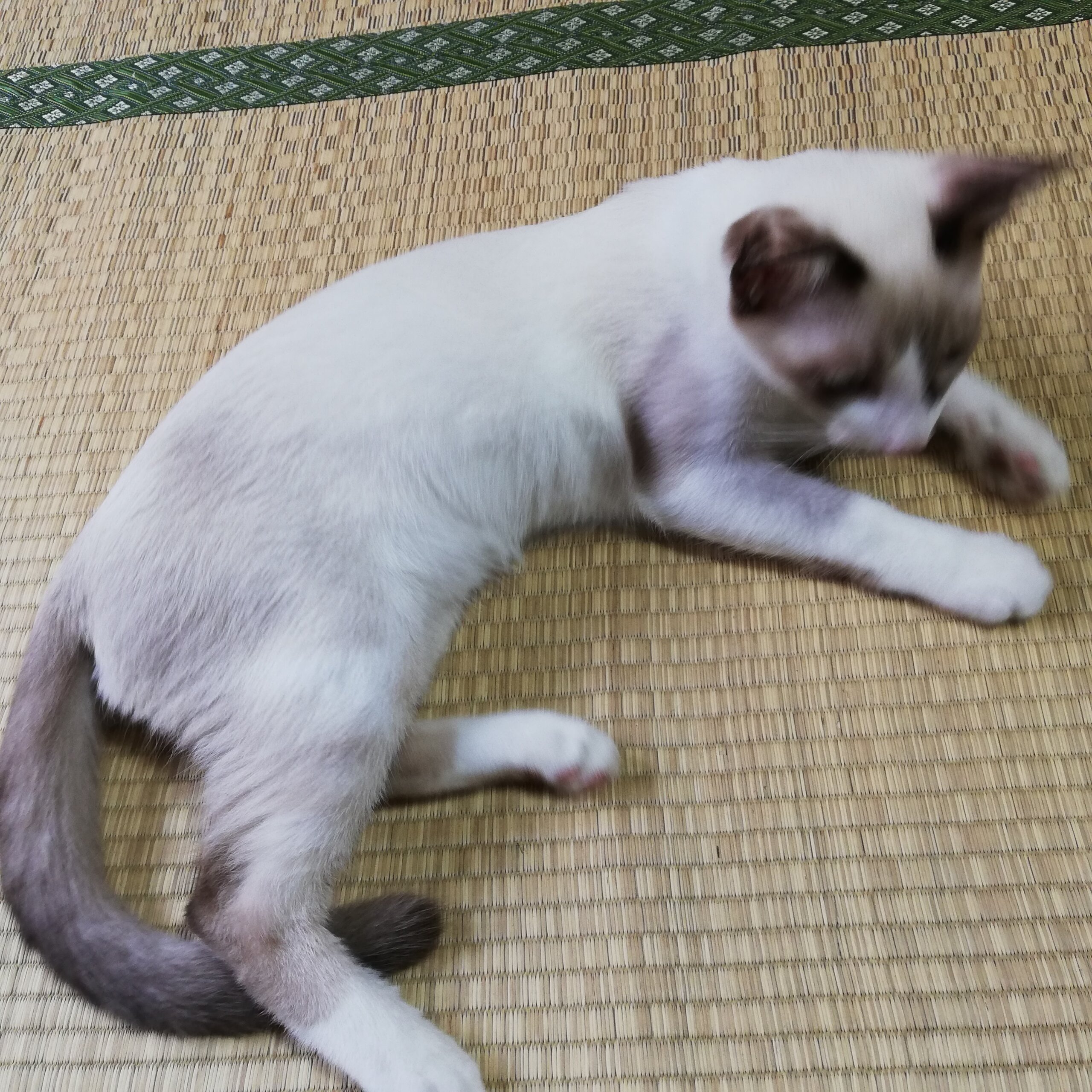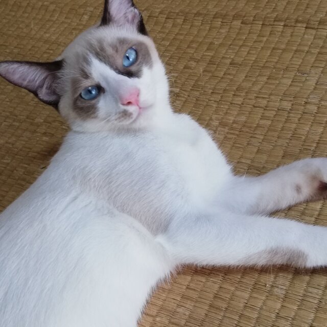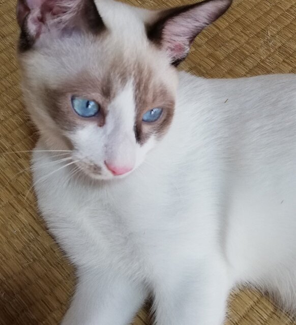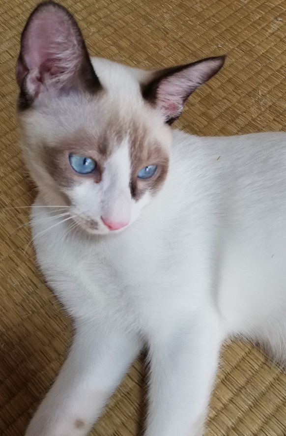 雑種のシャム柄(顔・尻尾)で、目の色はブルー、尻尾は長くストレートです。何事にも積極的な行動派ですが、意外と控えめな性格です。とても人懐っこく、人の膝やお腹の上で寝るのが大好きです。