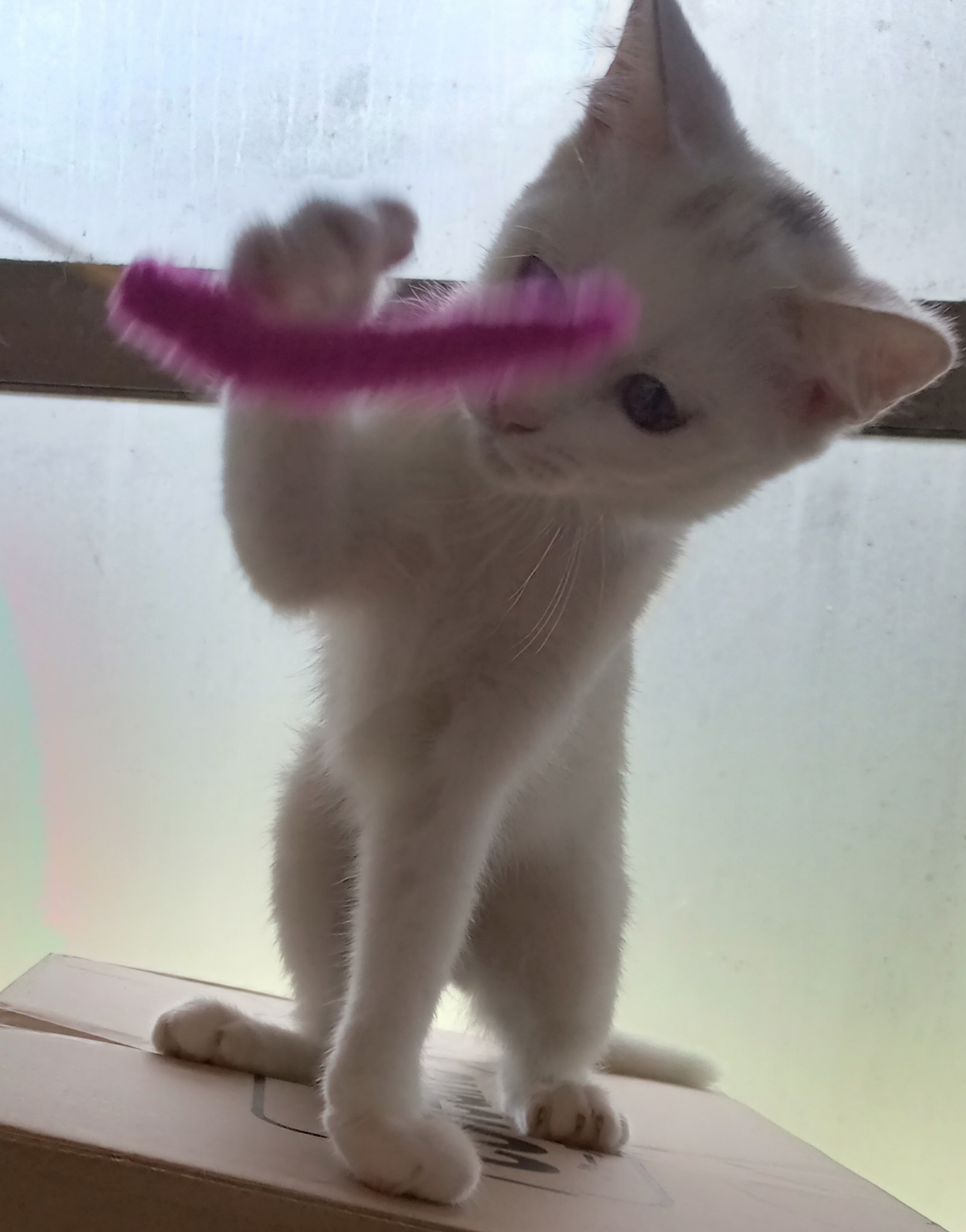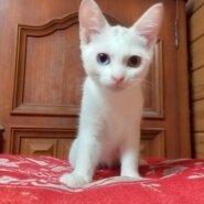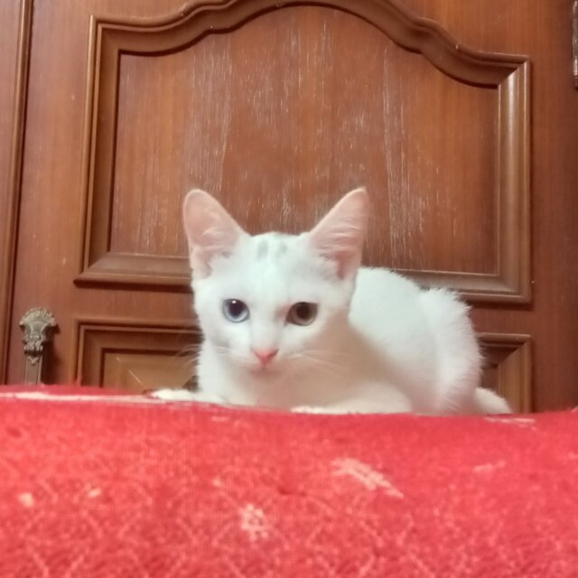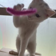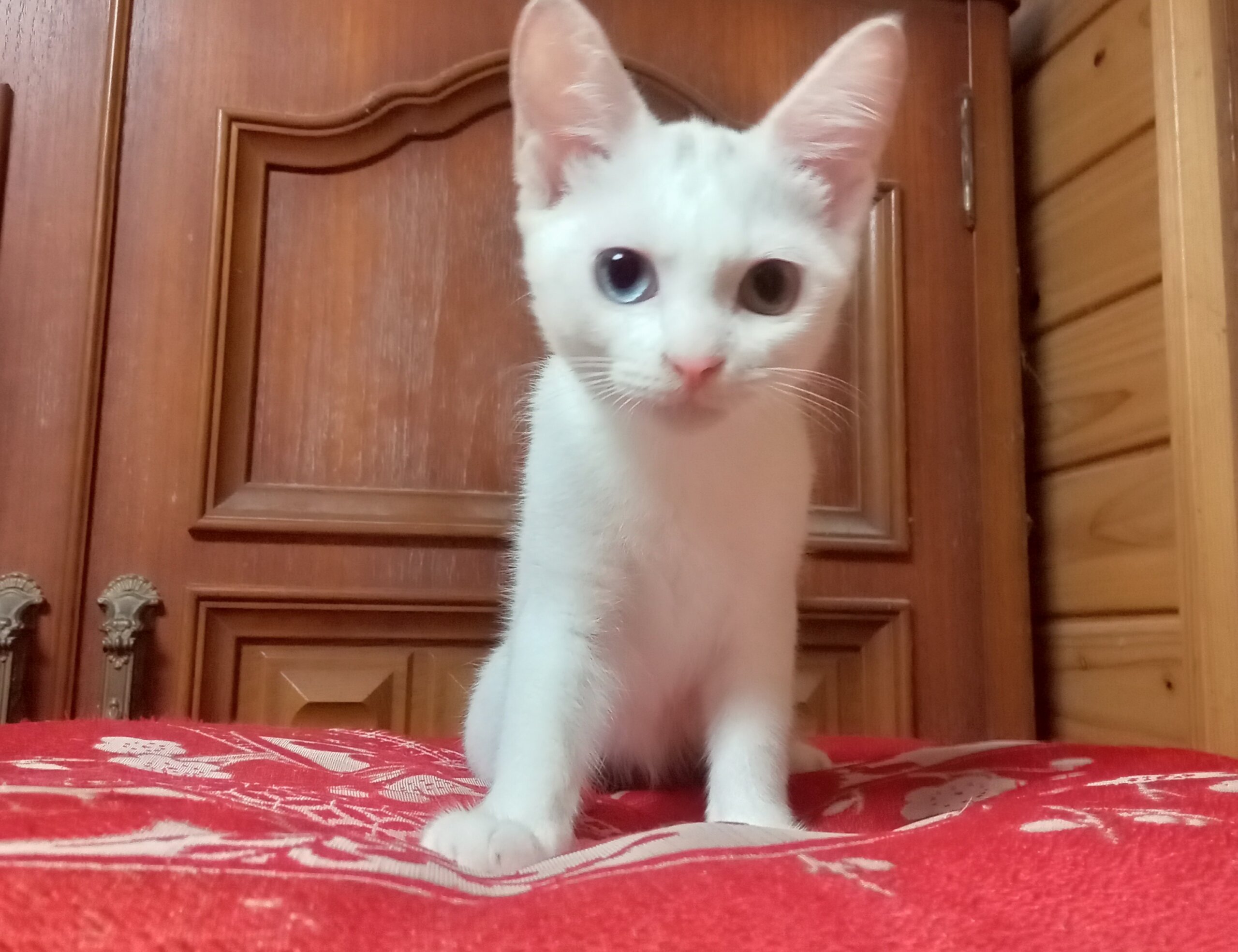 おでこにうっすら模様があるため、成長につれ模様が出てくるかもしれません。母猫はキジトラです。白猫詐欺などと言わないで下さい😿