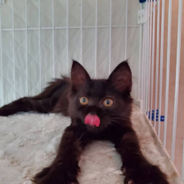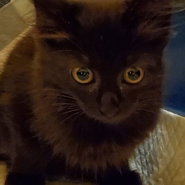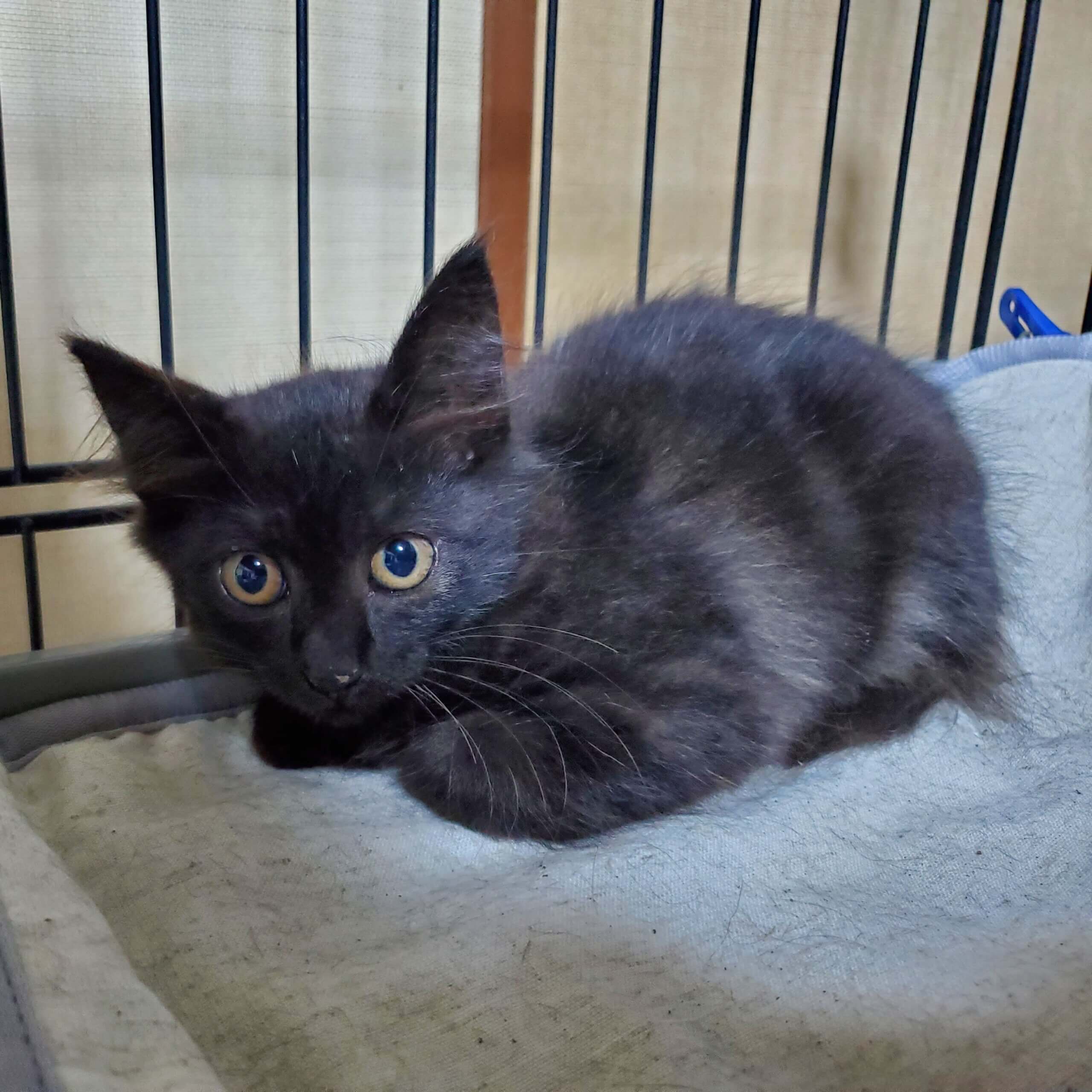 黒×グレーの少し長毛のモフモフしてて可愛い女の子です。シッポは少し短め。