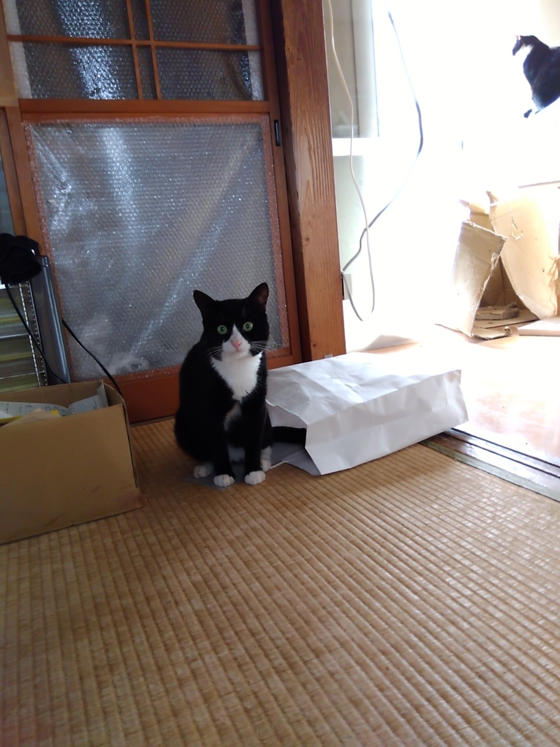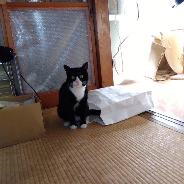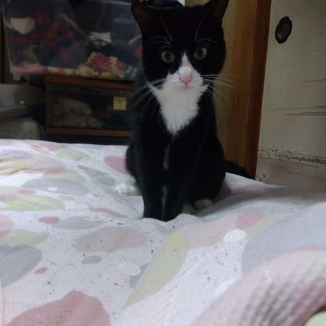 典型的な黒白のハチワレくんです。しっぽは真っ直ぐです。性格はおとなしめで、おっとりさんです。