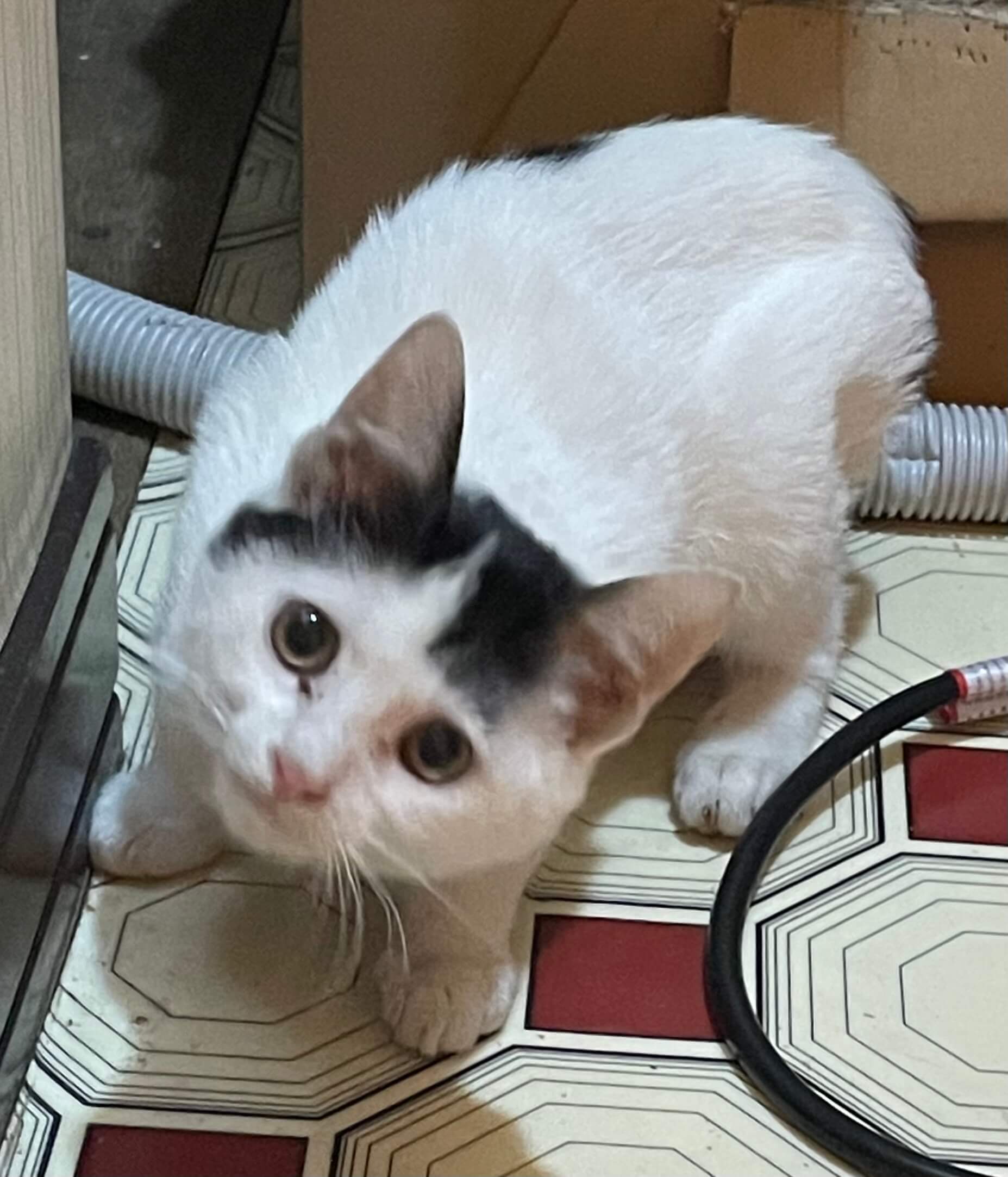 白地に一部黒い模様がある、ハチワレの男の子「フンちゃん」です。