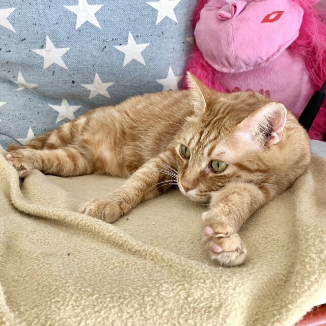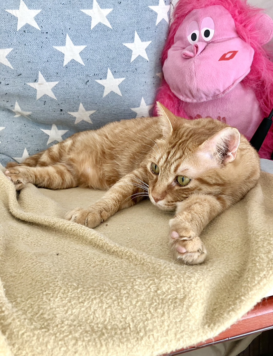 おもちゃにもノってくれるようになってきました。猫に対してはとても友好的で、初対面の猫をペロペログルーミングしてあげる優しい性格。