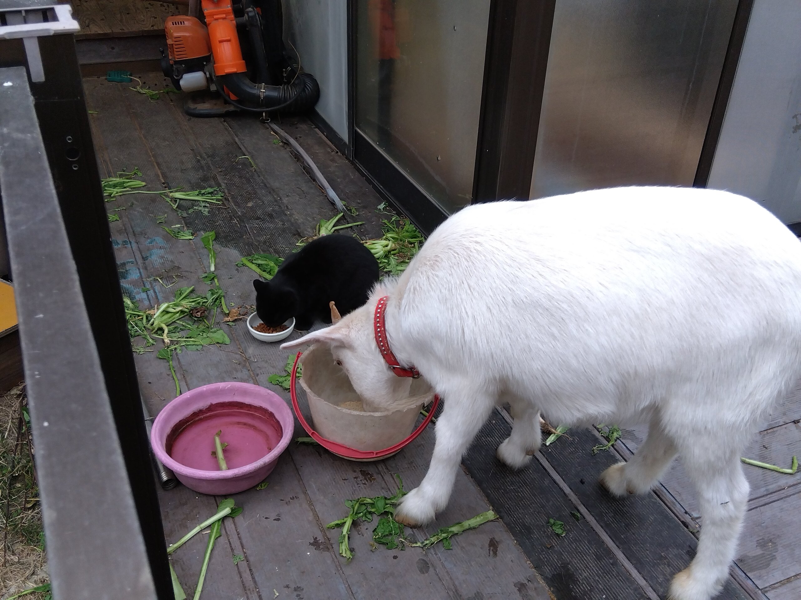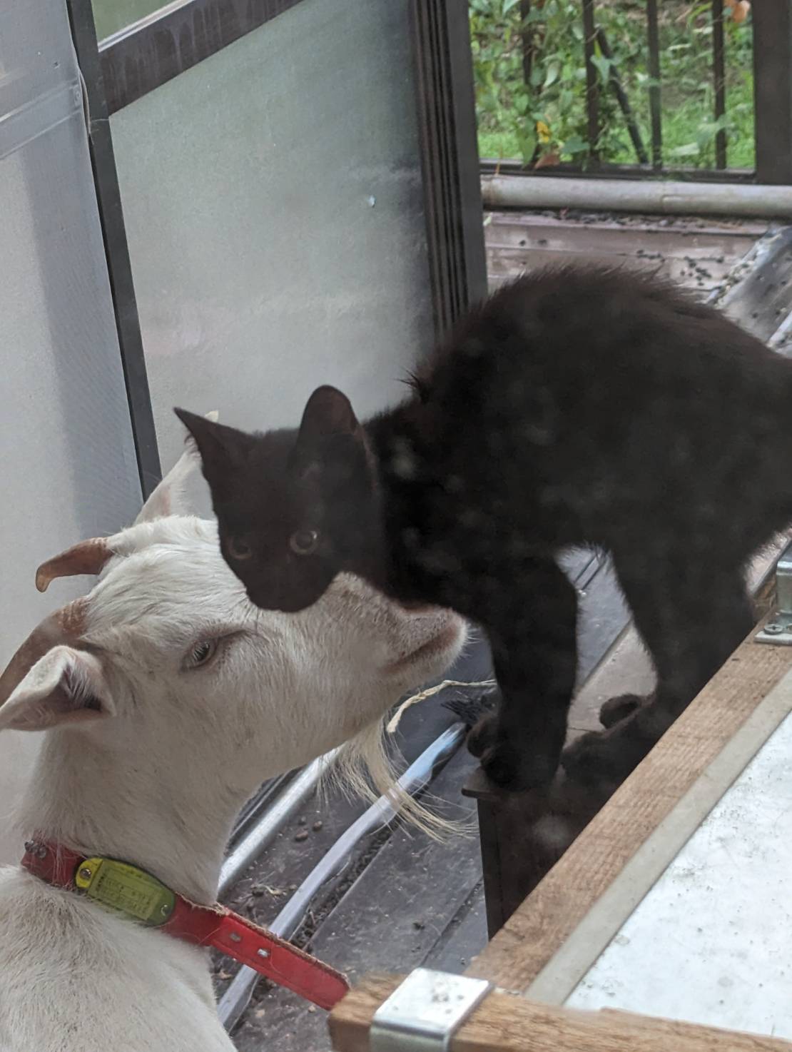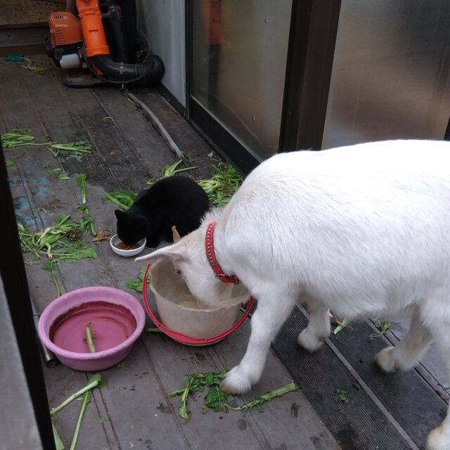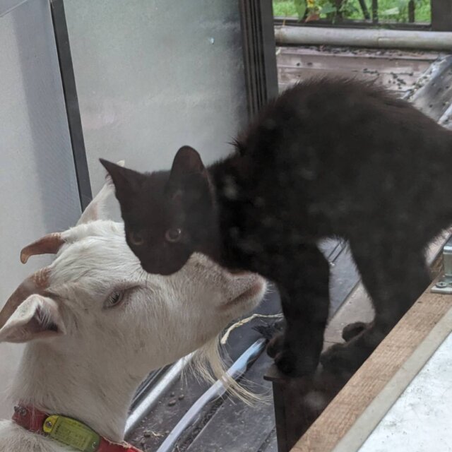 我が家では、雄雌一匹ずつの猫と、山羊を飼っているほか、耳カットされた地域猫を世話しております。ある日突然、黒い子猫が現れ、山羊小屋に居つき、地域猫と一緒に餌を食べるようになりました。とても愛らしく、情も湧いているのですが、これ以上動物を世話する余裕がなく、ぜひ良い人に里親になっていただきたく、募集させていただきました。