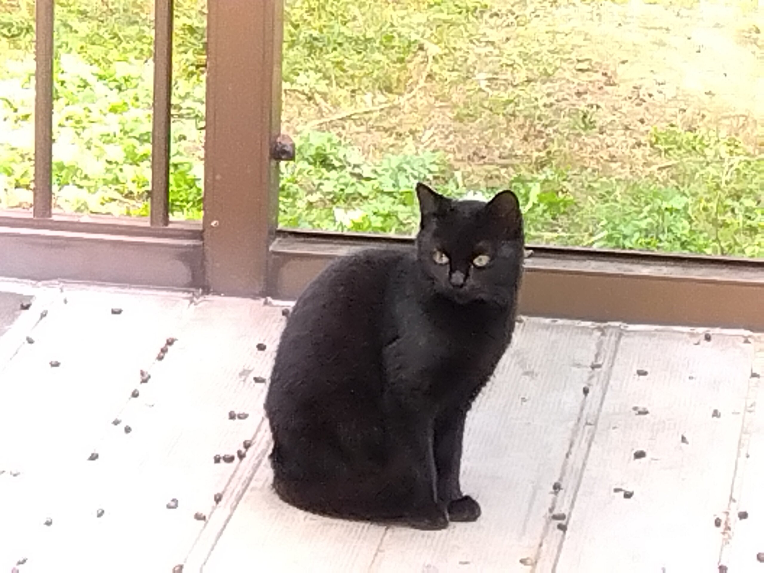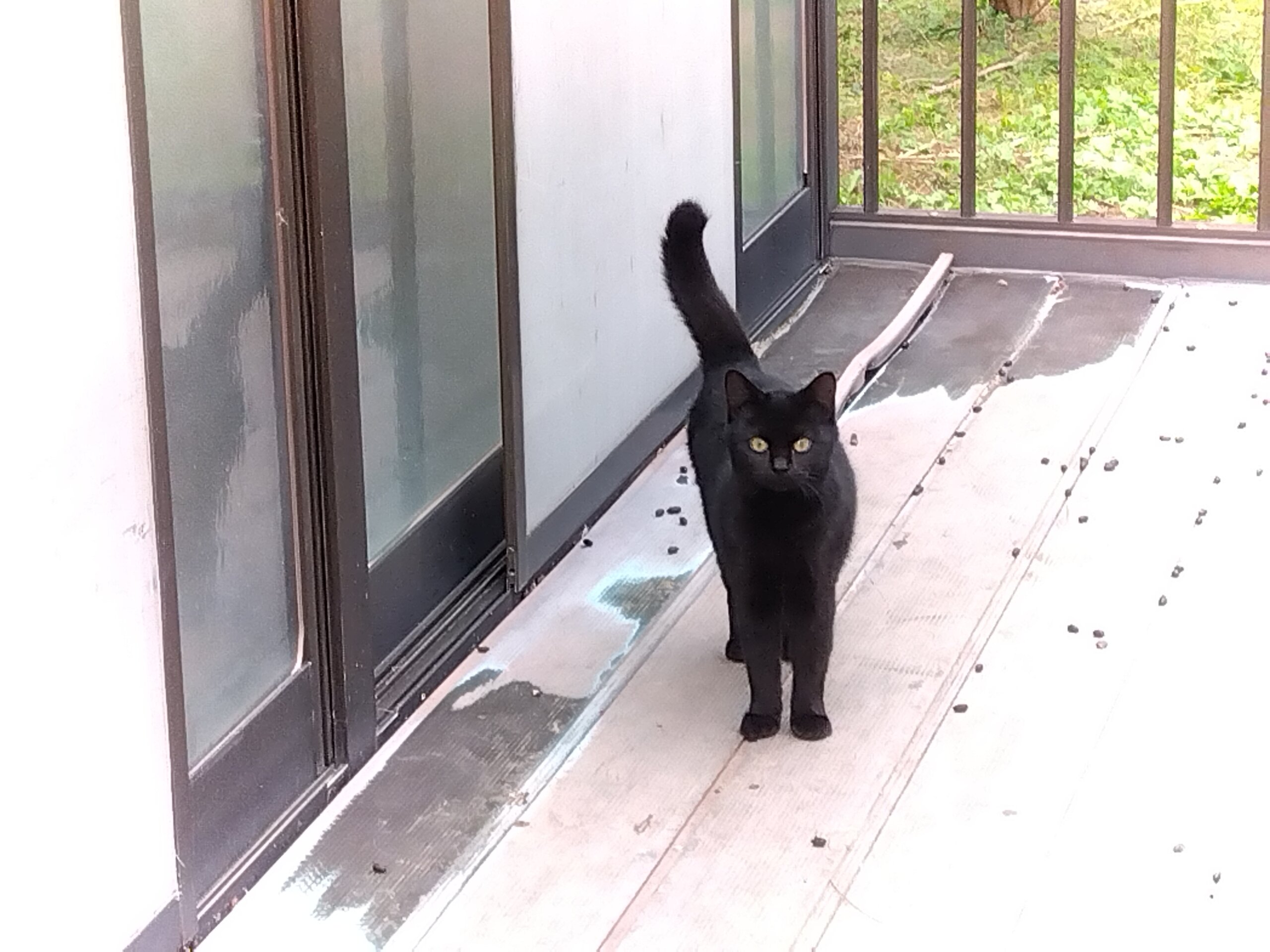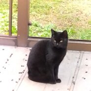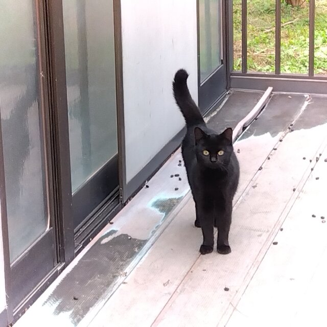 目がぱっちりした黒猫です。しっぽは長くまっすぐ。野良猫ですが、ずっと餌をあげていたので、人なれしており、抱っこもさせてくれます。もともと物おじしない人懐こい性格のようです。