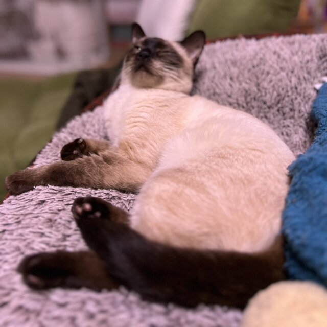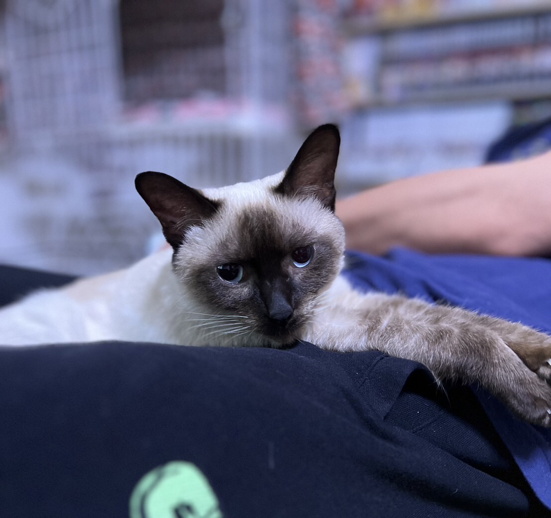 とても可愛い瞳がブルーのシャムミックスの女子です。人馴れ抜群で、抱っこ、ナデナデが大好きでとても甘えん坊です。お留守番のあるお家でも大丈夫ですが寂しがりやなので、長いお留守番のないお家を希望します。初心者様にもおすすめです。お外で苦労していたのか、ガリガリに痩せていたので、心配で血液検査をしましたが問題ありませんでした。少し貧血気味だったので、栄養のあるフードで体調管理しています。