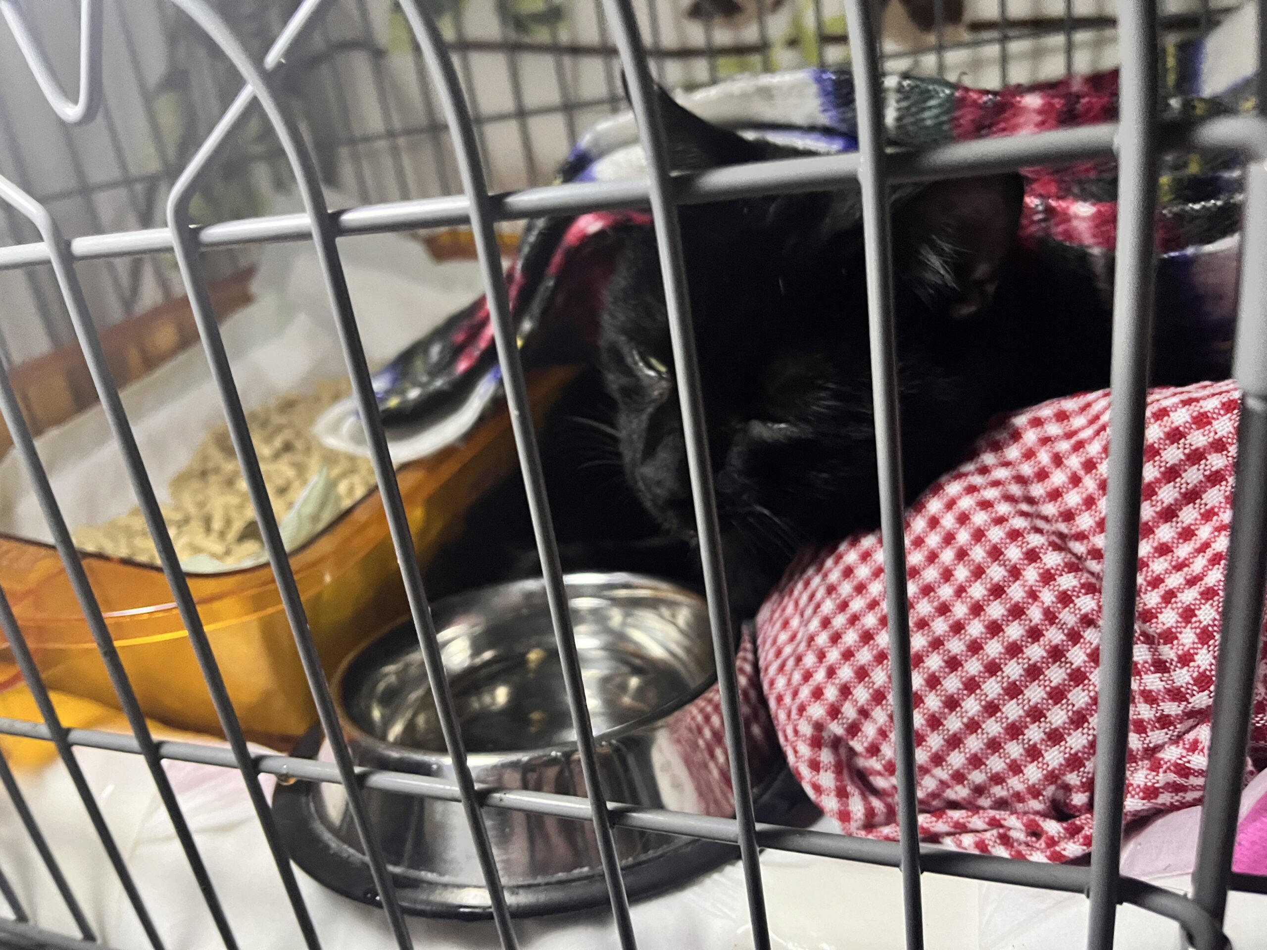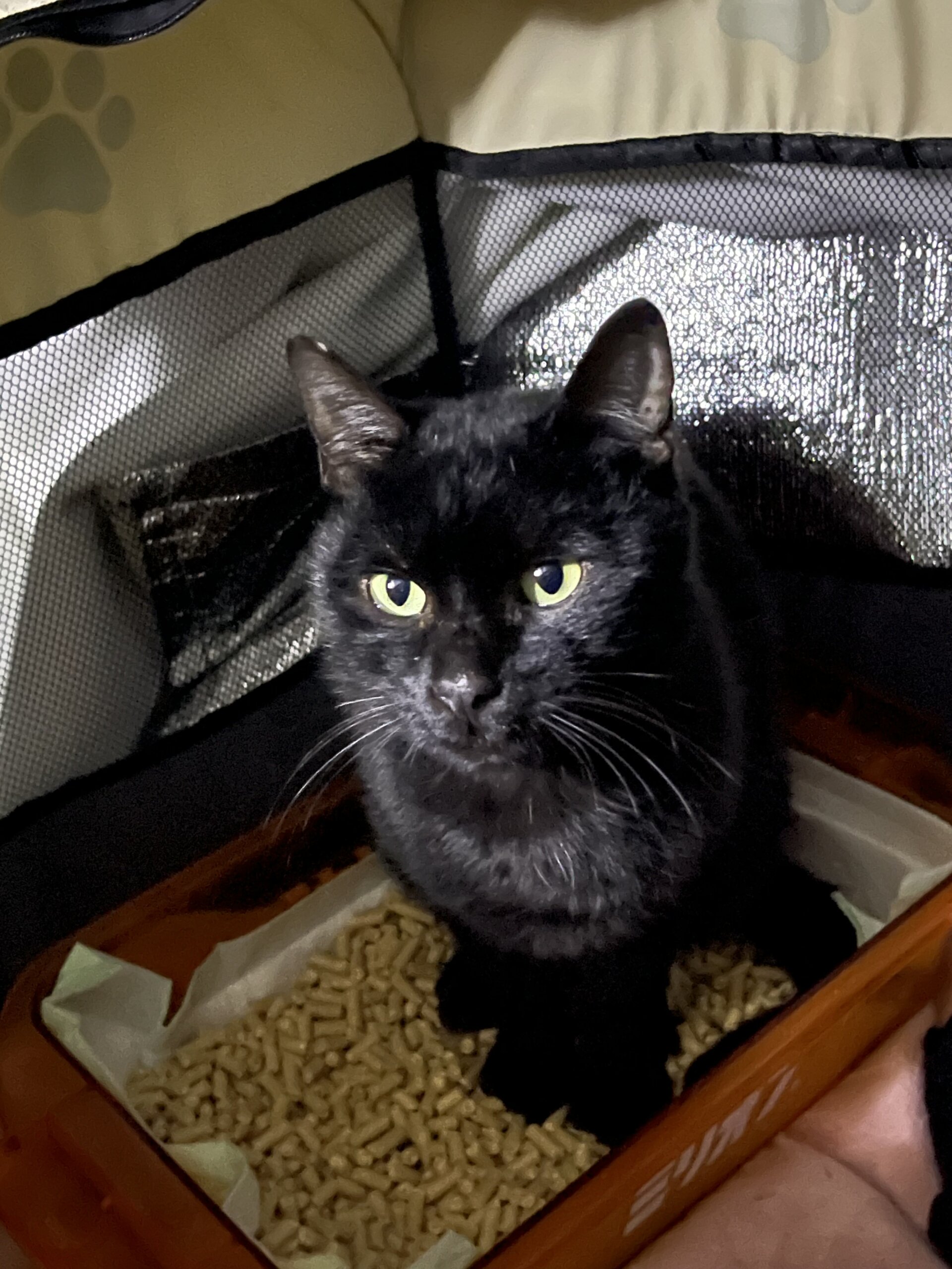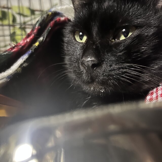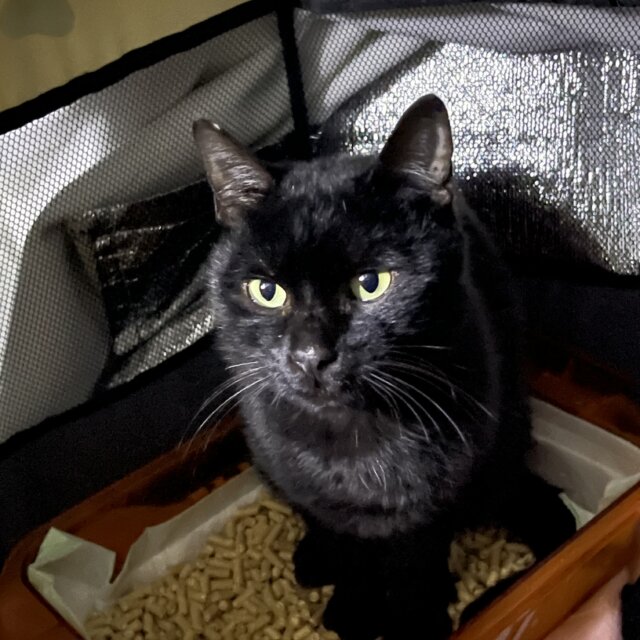 保護した時より少しずつ毛艶が良くなってきました。ご飯もいっぱい食べてお水も飲んで綺麗なうんちも出ます。名前はエナです。エナジーチュールを買って帰っていた時にお腹が空いて落ち葉を食べていたエナを見つけ、すぐエナジーチュールを食べさせました。すごく運とタイミングがいい子だと思い、猫好きの優しい里親様に早く見つかるように名付けました。