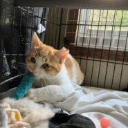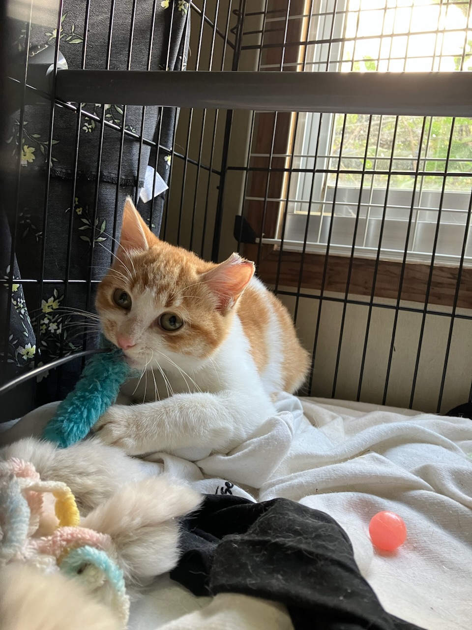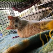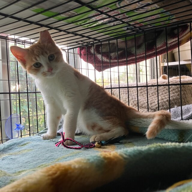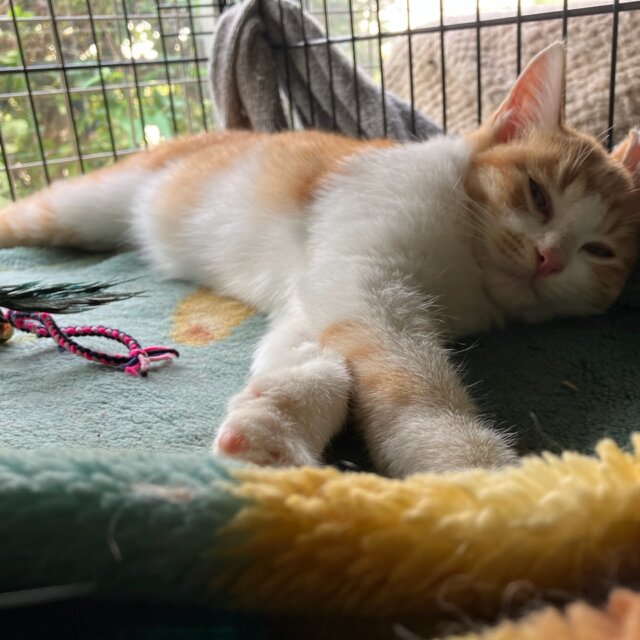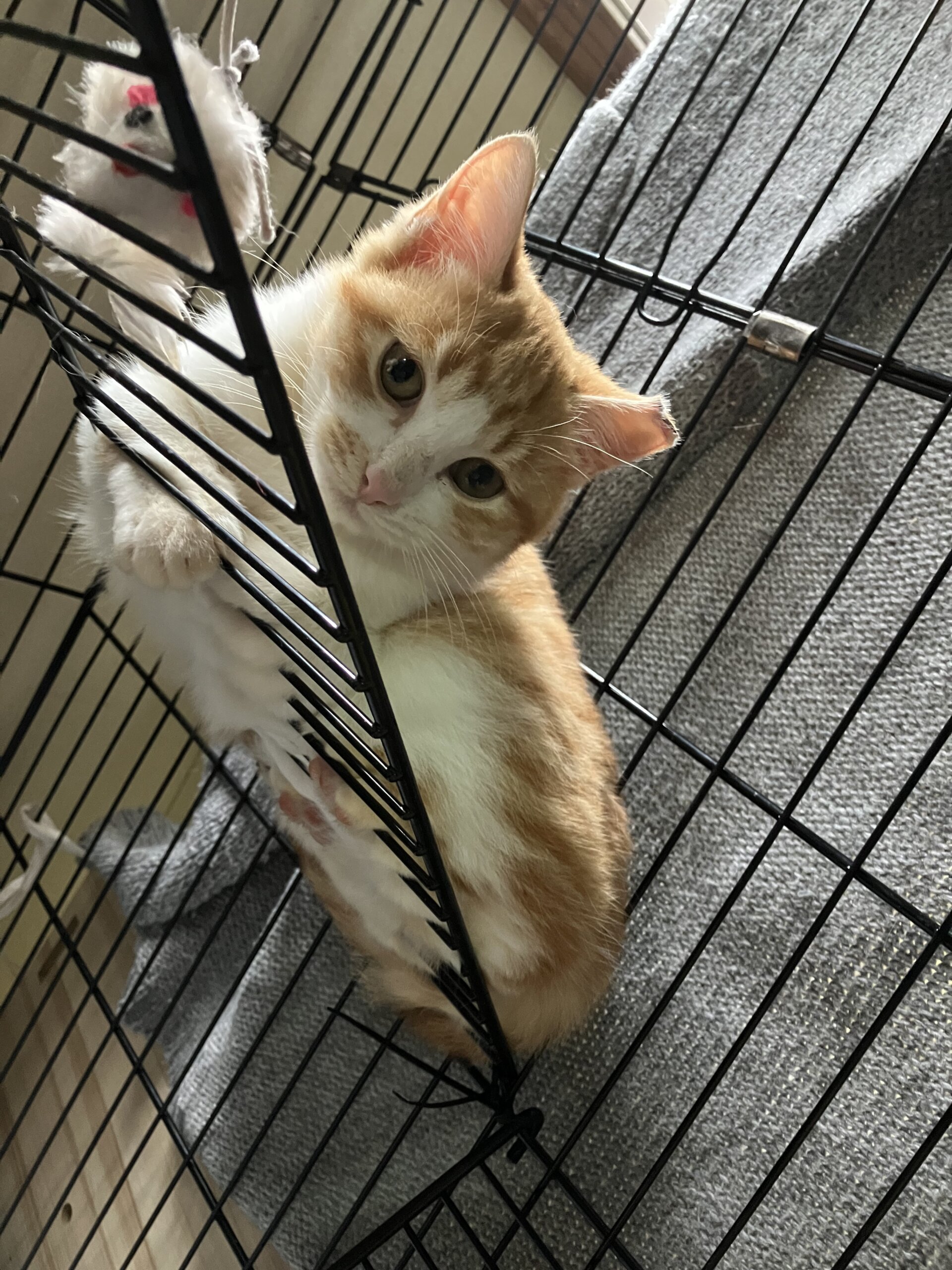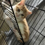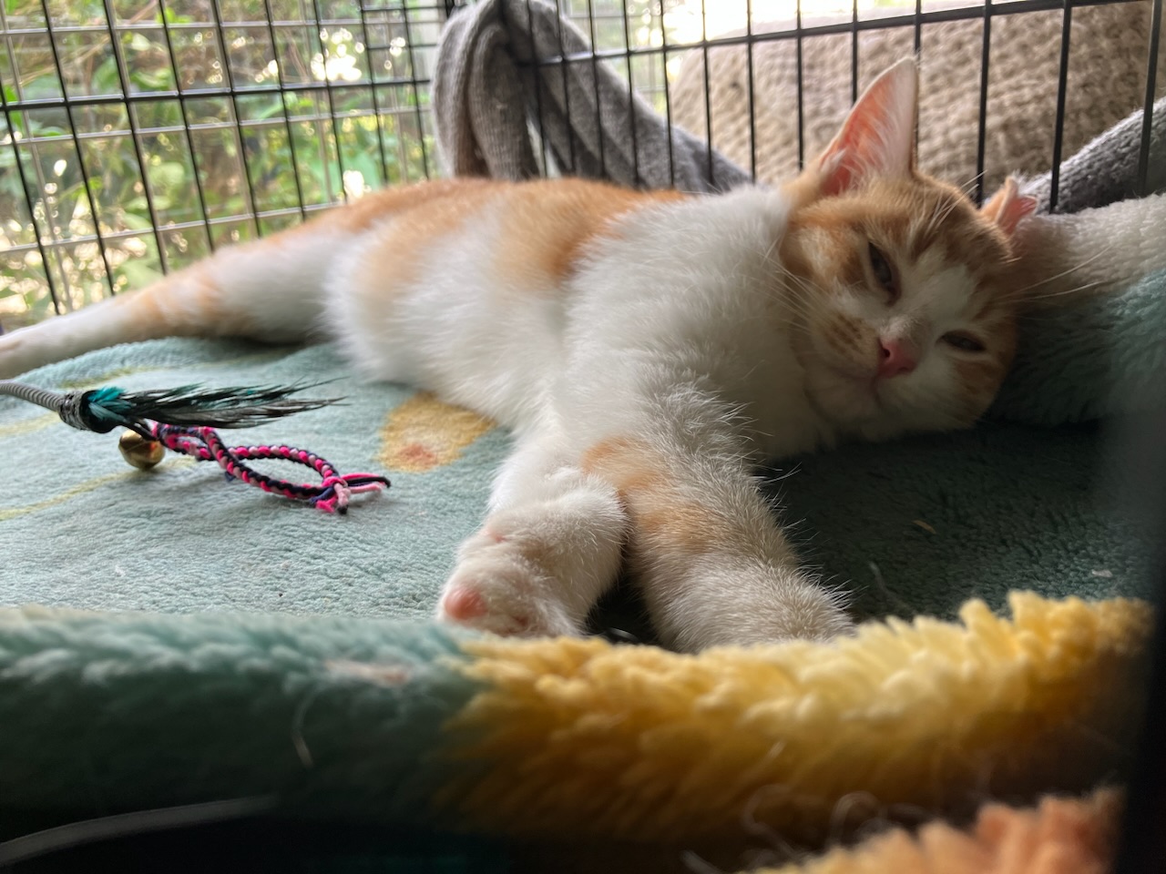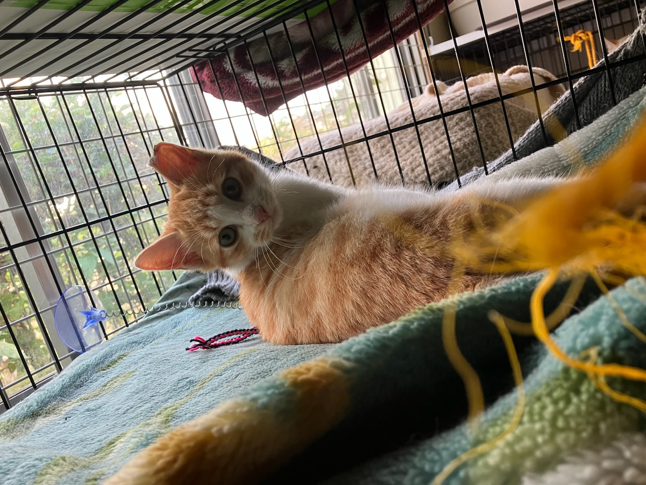 現在はケージの中にいますが、他のにゃんこちゃんたちに甘えた声で鳴いて甘えようとしているようです。