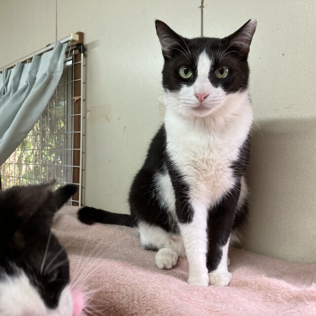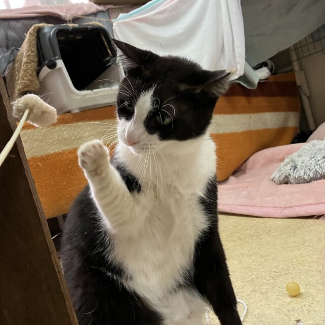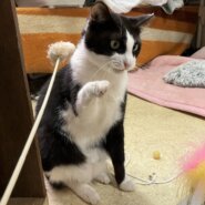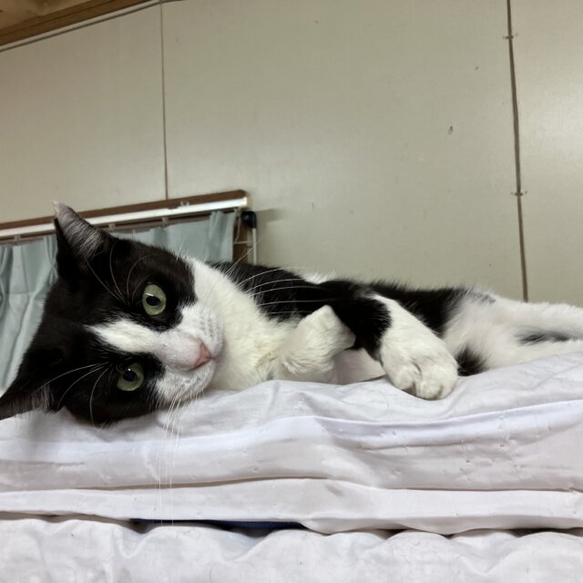 ぽんくんはハチワレ柄の男の子で年齢は5〜6歳前後かなぁと思われます。体は大きい方でお顔もキリッとしたお目目で、一見クールで強そうな感じに見えますが、警戒心は強い方で、案外怖がりさんで、いまだに抱っこはぴょんと逃げられてしまいますし、甘えん坊さんでもあるところとかも可愛いんですね。