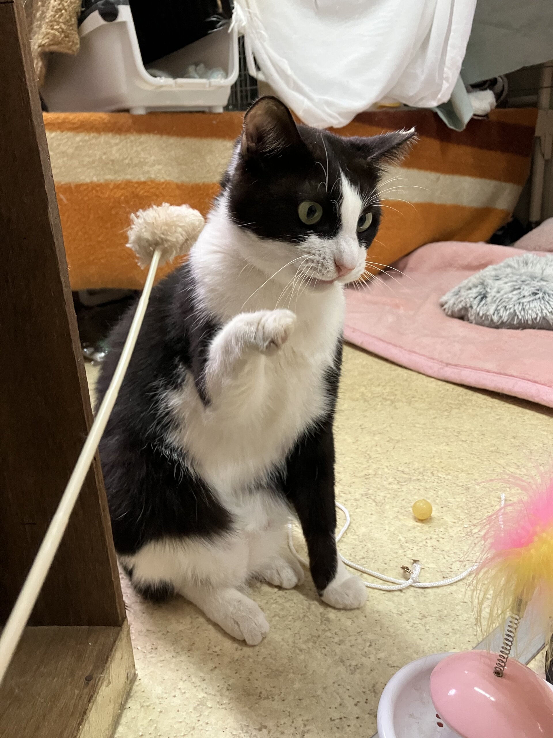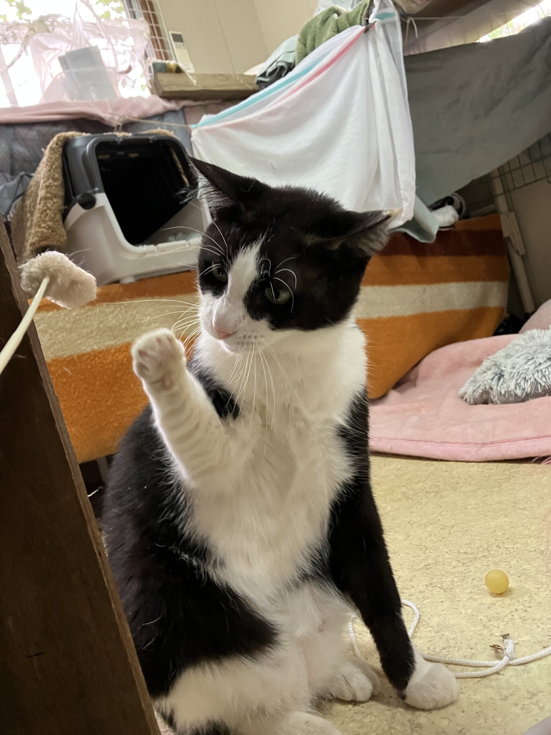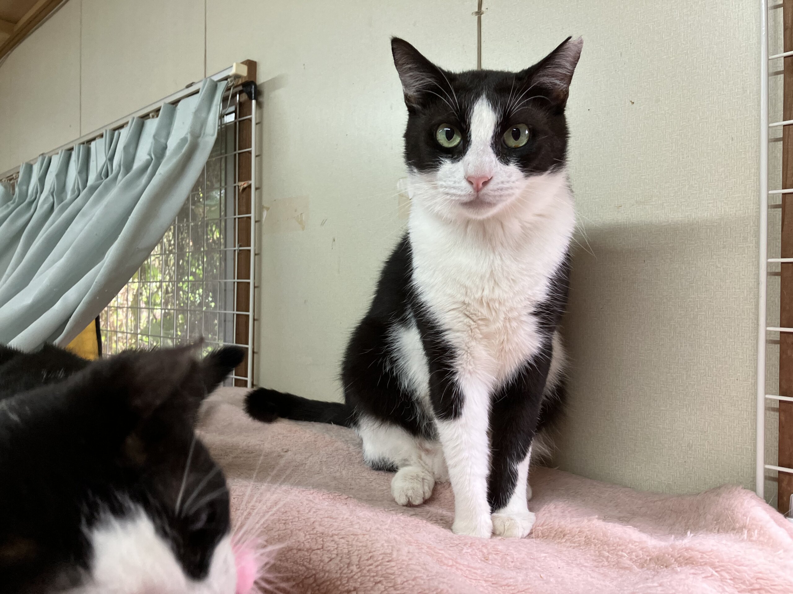 そして実は甘えん坊さんで、私が猫部屋に入ろうとドアを開けるといつも1番前で待っていて、ニャッニャッと鳴いて、つぶらな瞳でこちらを見上げてきて、ナデナデしてくれるのを待ってくれているんです。ナデナデすると嬉しくてミニジャンプをして頭を突き出すところも可愛いんですね。