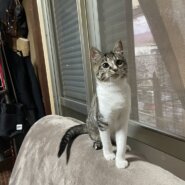 今も角膜炎の影響で左目が多少白くなっていますが日常生活に問題はありません。我が家には2匹先住猫ちゃんがいまして1匹の猫とは仲良くなっているのですがもう1匹の猫と相性が悪く先住猫が下痢、膀胱炎になってしまい…苦渋の決断ですが出すことに決めました