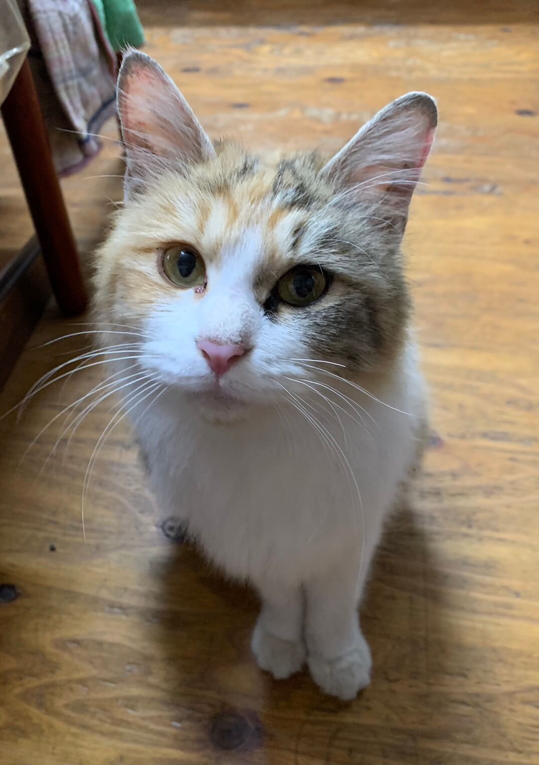 三毛猫お母さんはとても人懐っこく抱っこも出来、膝の上でリラックスする程警戒心はありません。