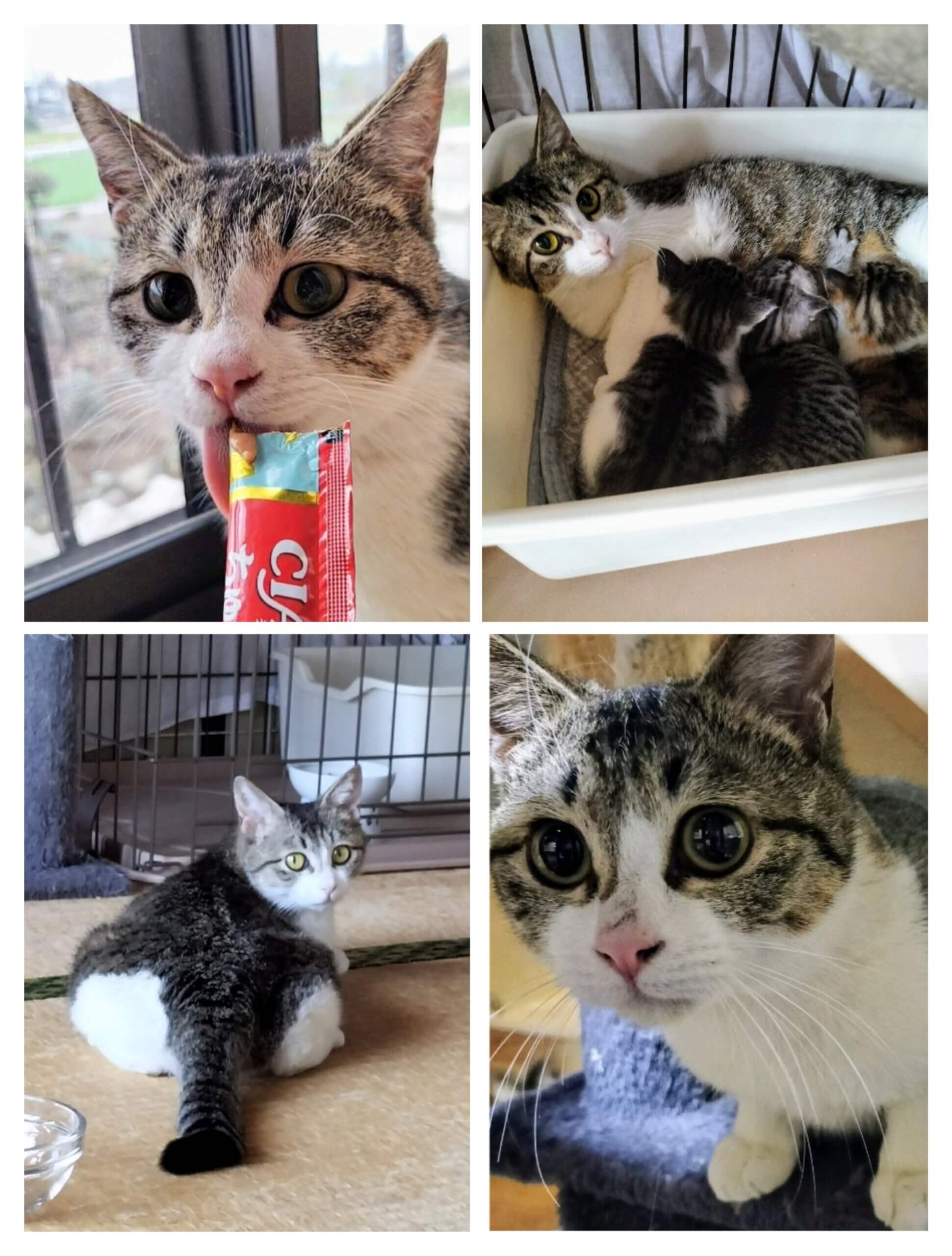 突然の事でうろたえる人間をよそに、ししゃもちゃんは立派に産み、子育てに奮闘しています。子猫を慈しみ大事に育てる母猫と、