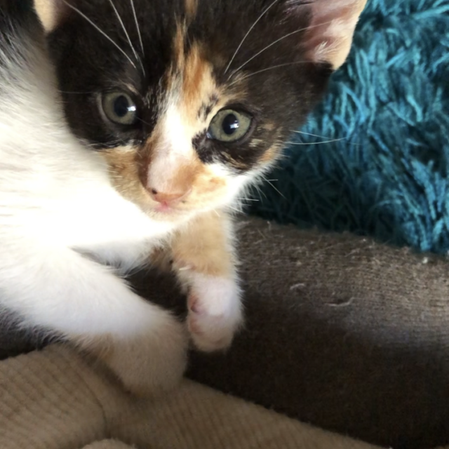 兄弟の中でも1番目に人馴れした子で、母猫から離れ好奇心か芽生えた頃、隔離部屋に入ると真っ先に人の元へと出て来てくれて、それを見た兄弟がついてきてくれる様になったので、この三毛ちゃんのおかげです⭐︎