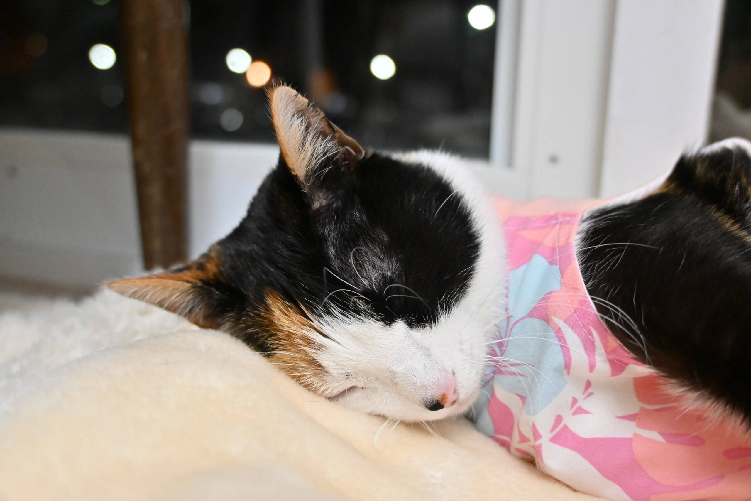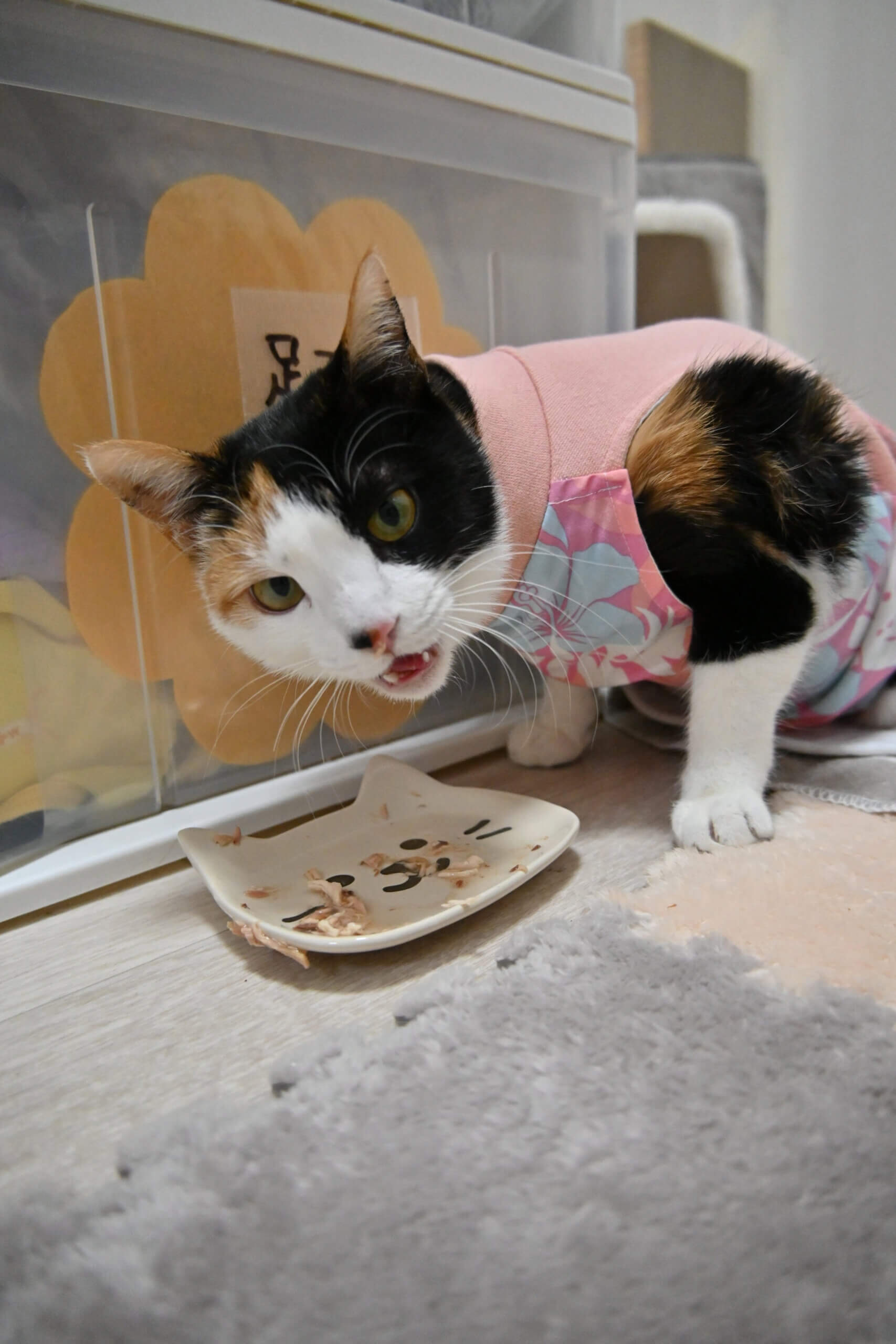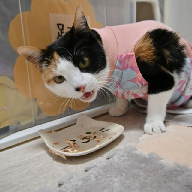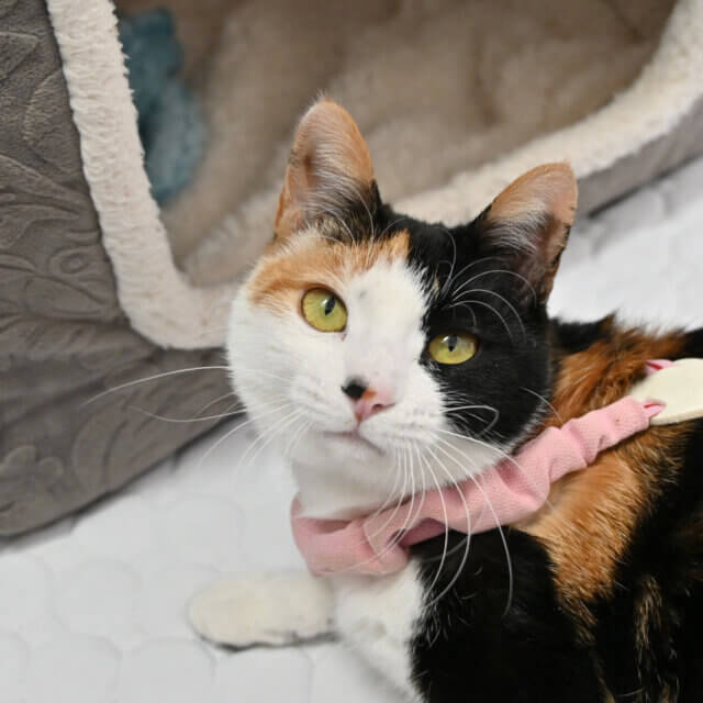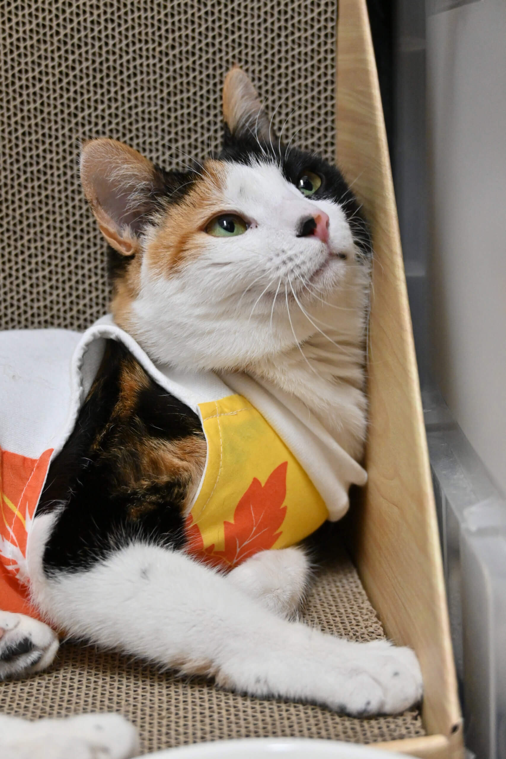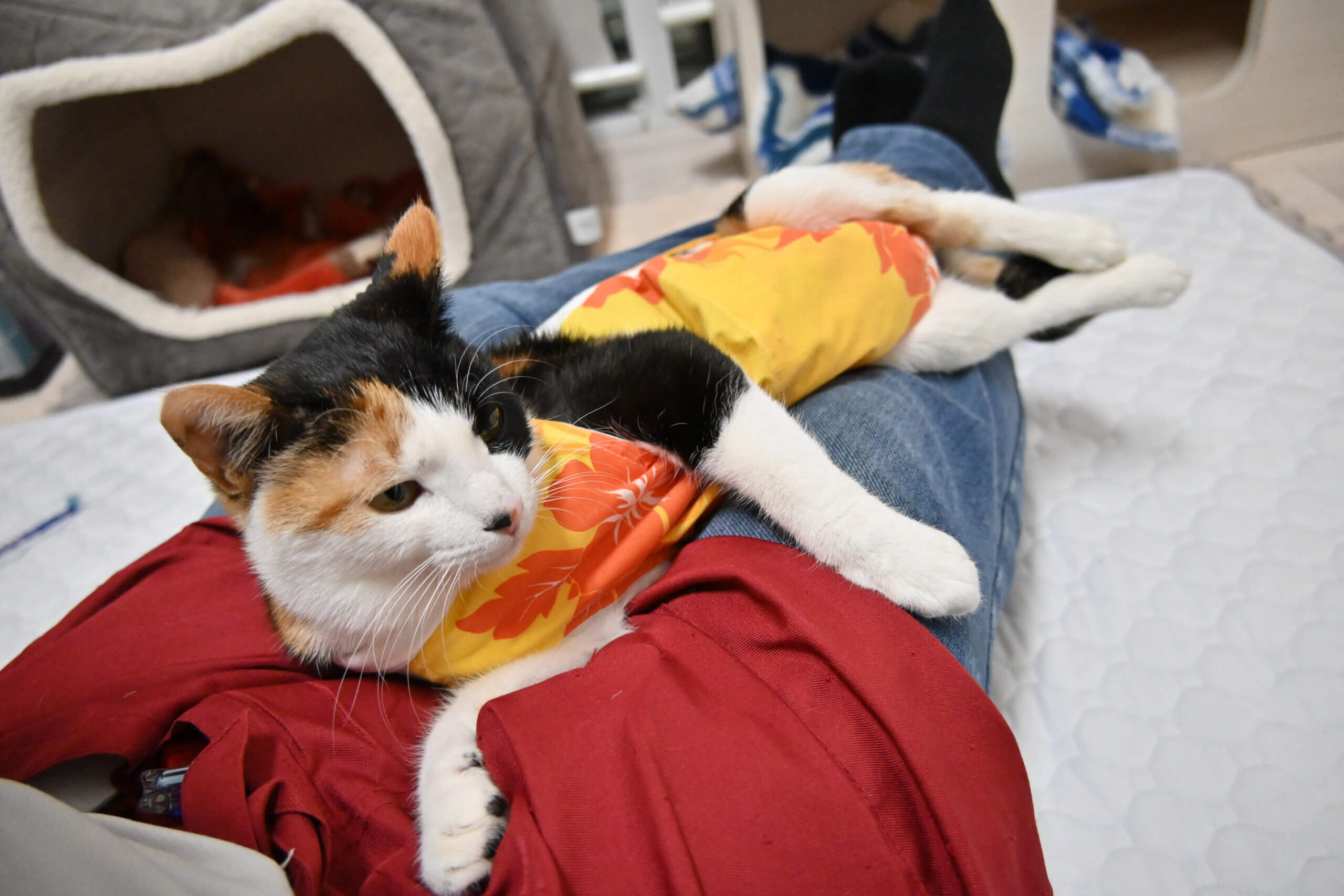 最初はシャーシャー威嚇激しく、スタッフも四苦八苦しながらお世話していましたが、毎日触れ合うにつれ、今ではすっかり人が好きな穏やかな猫に成長しました。傷も手当てし、本人もそれに耐えて、今では完治。下半身不随ですが、リハビリを毎日頑張っているので、開始当初に比べて格段に効果が出ており、いつか歩けるようになると希望を持っています!