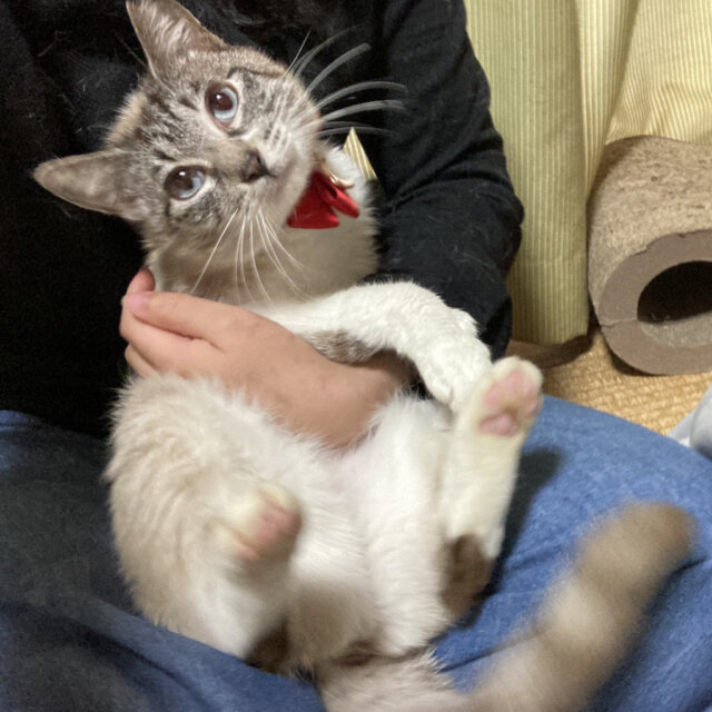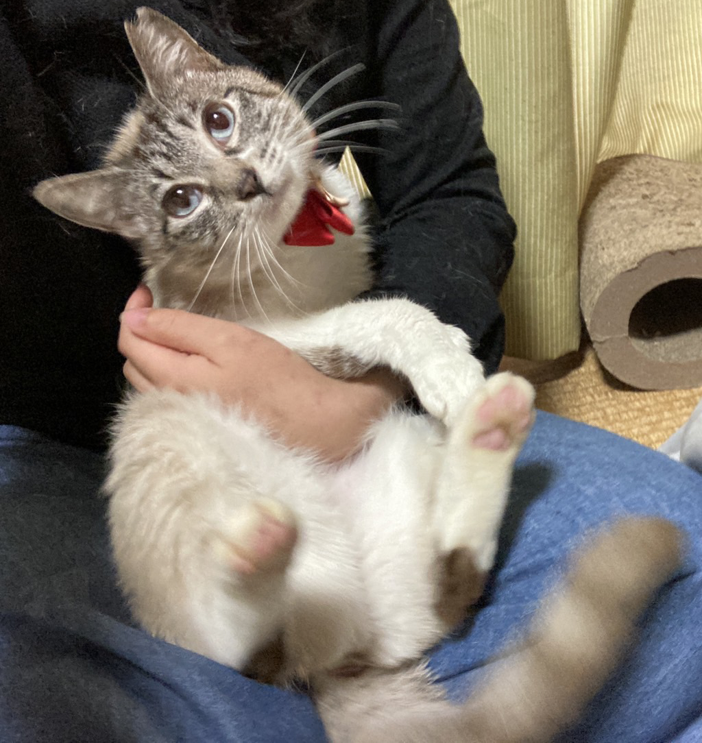 慣れるまでは1ヶ月以上かかりますので、ナナちゃんのペースに合わせて、ゆっくり距離を縮めて頂けたら嬉しいです。いったん心を許した相手にはベッタリで、頭をすりよせてきたり、お腹をみせたりして、全力で甘えてくれます。