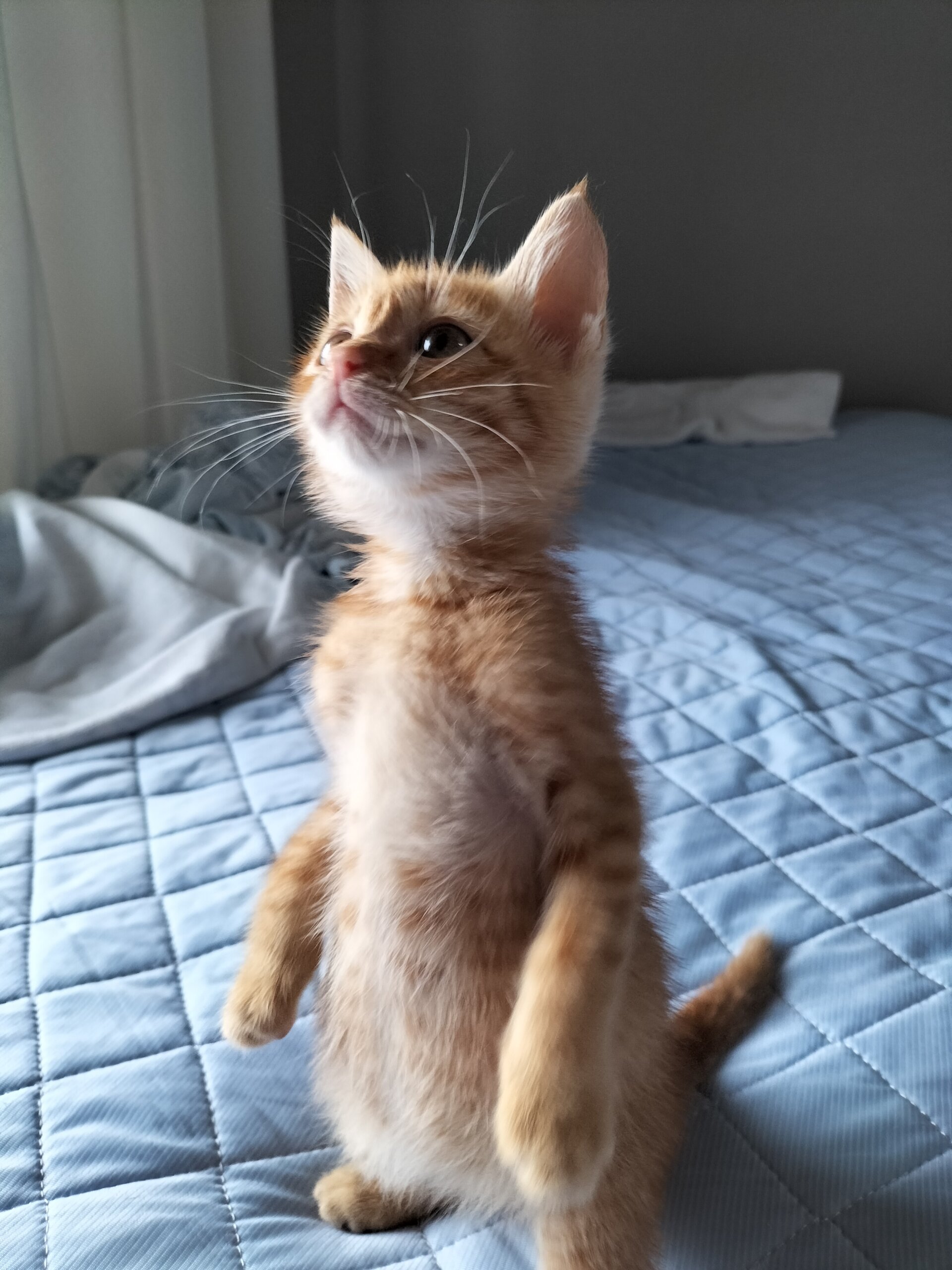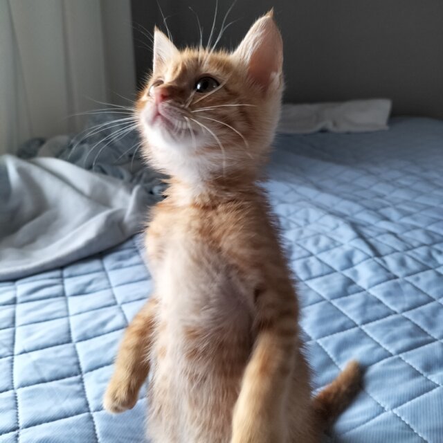 すっかり元気になり、よく遊びます!急発進するミニカーのようです。それでいて、べったり甘えてきますので、相当なひとたらしです。よく食べ、よく寝ます。起立します!おしゃべりします。