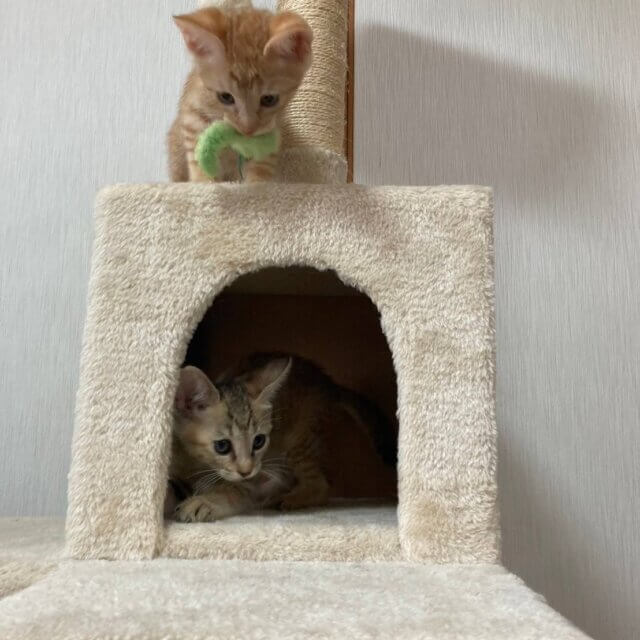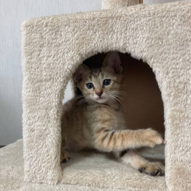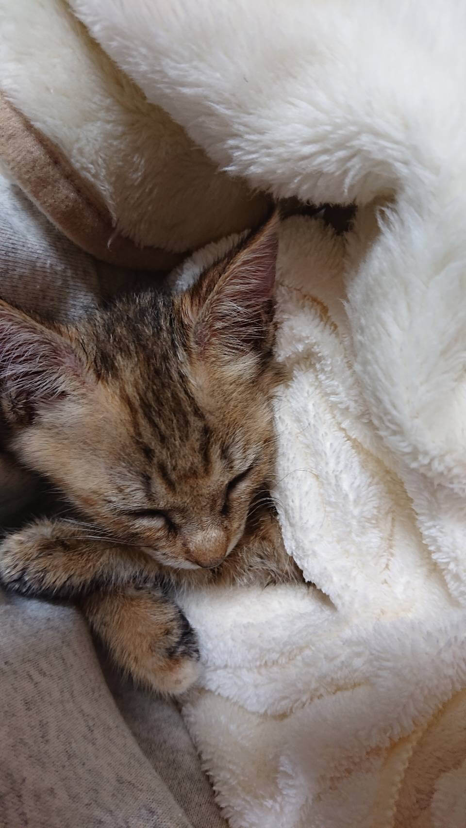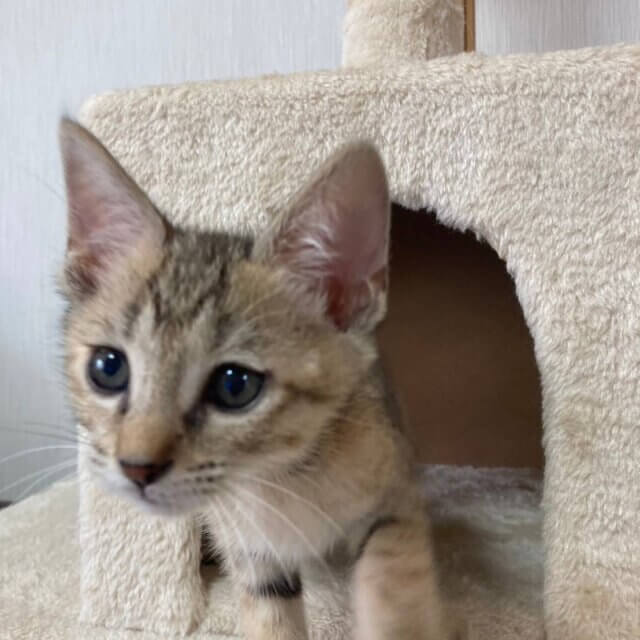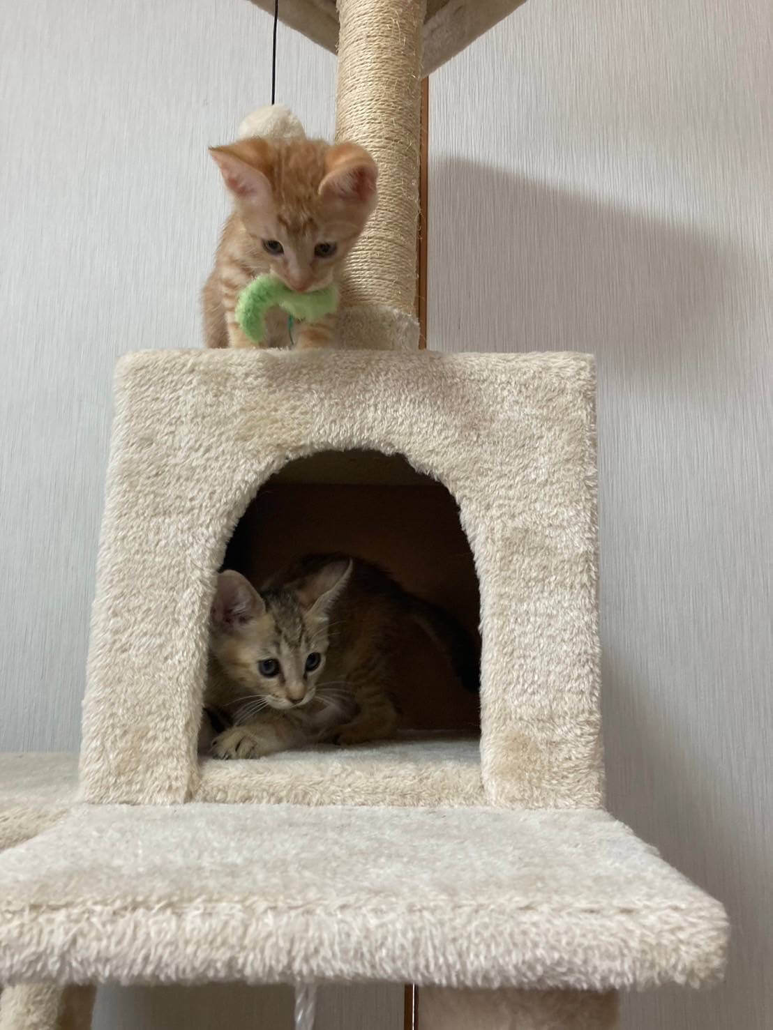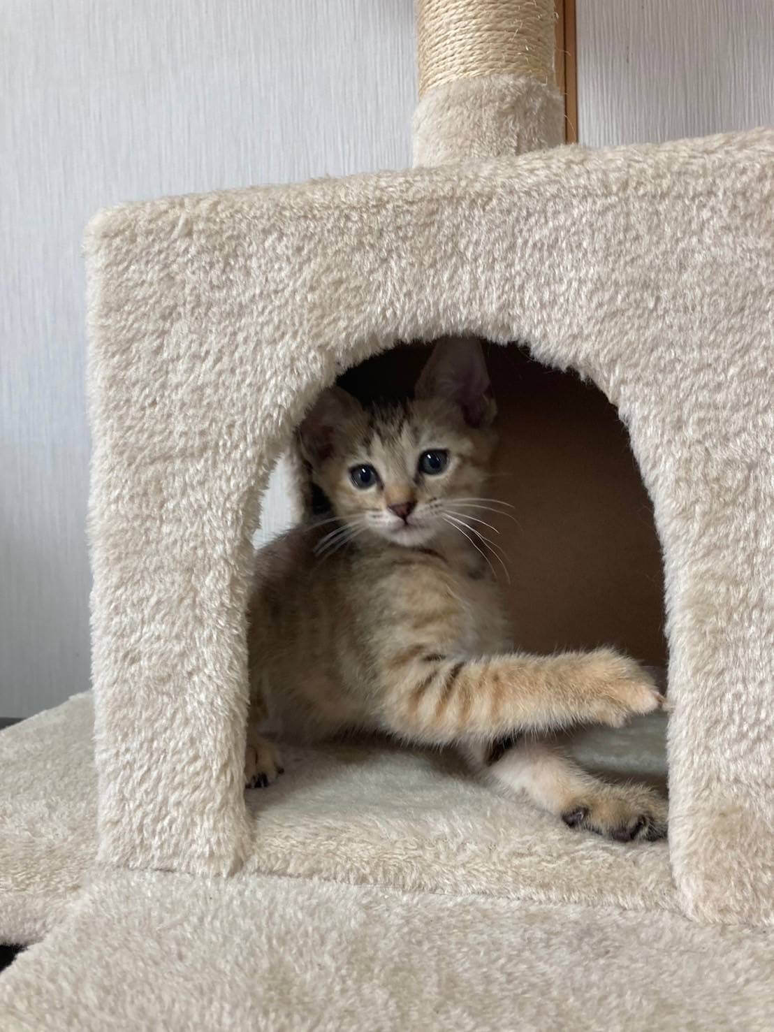 推定1.8ヶ月のサビタビーの女の子です。ちょっと控えめで、膝の上からまわりを見るのが好きで、兄の『たむ』を見て、自分がどうすれば楽しく遊べるか考える学習力の高さがある賢い子です。いつも兄の『たむ』と追いかけっこして遊んでいるので、一緒にずっとのおうちに行けたら嬉しいです。まだ小さな子猫のため、お留守番の少ないお家を希望します。2匹一緒に初心者様にもオススメです。