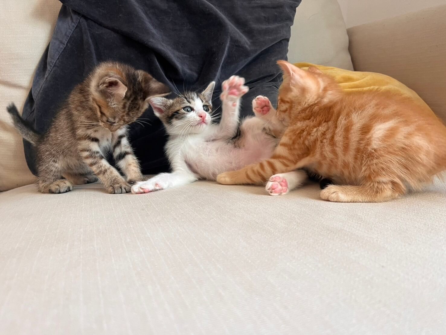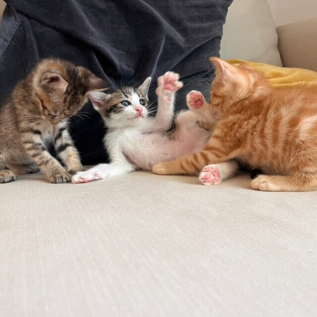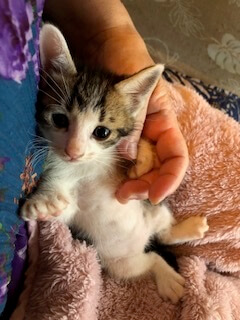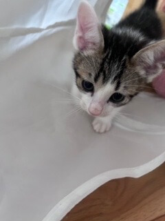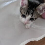 推定1.8ヶ月のキジ白のイケメン男の子です。遊び大好きで、冒険心があって活発な感じです。高いところに一番先に登ったり、リーダー感があります。子猫らしくちょっとドジっ子なところもあります。妹や弟と一緒にずっとのおうちに行けたら嬉しいですが、先住ちゃんのいるおうちや初心者様にもオススメです。まだ小さな子猫のため、お留守番の少ないお家を希望します。