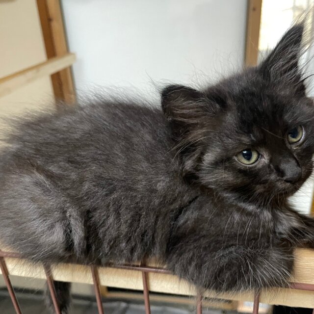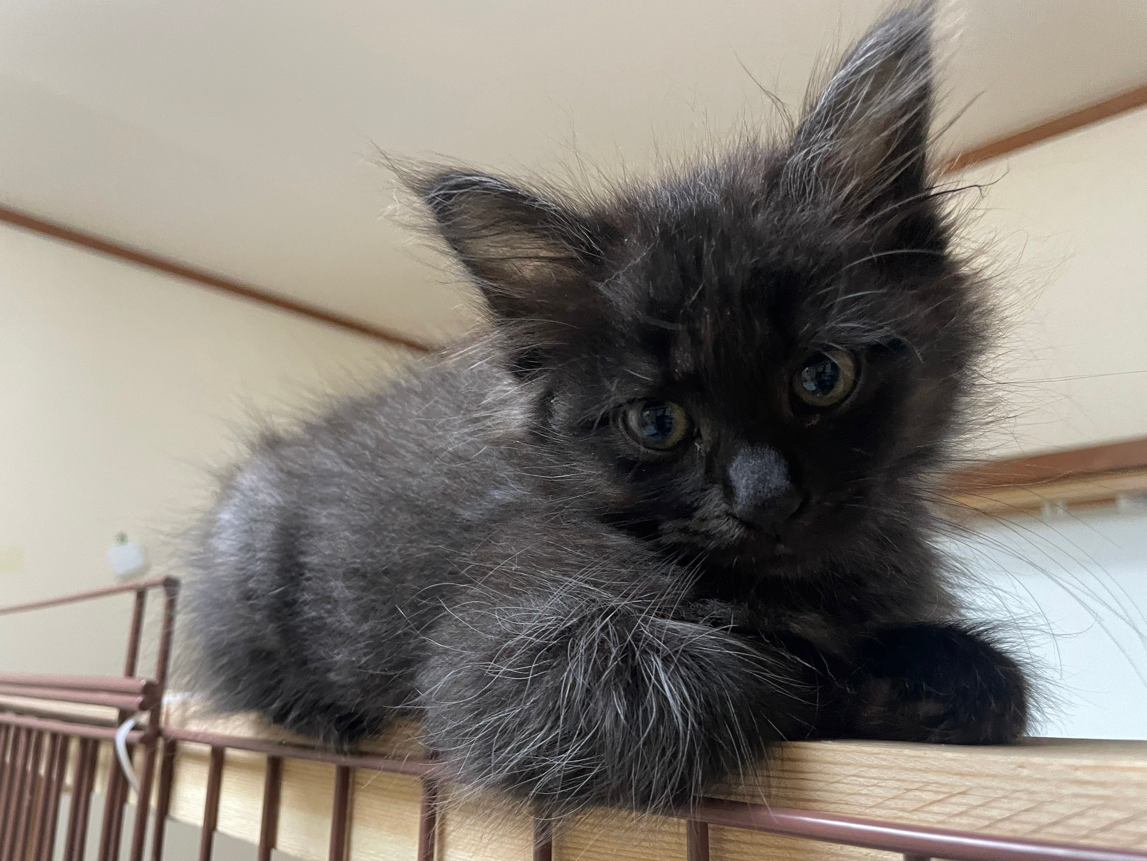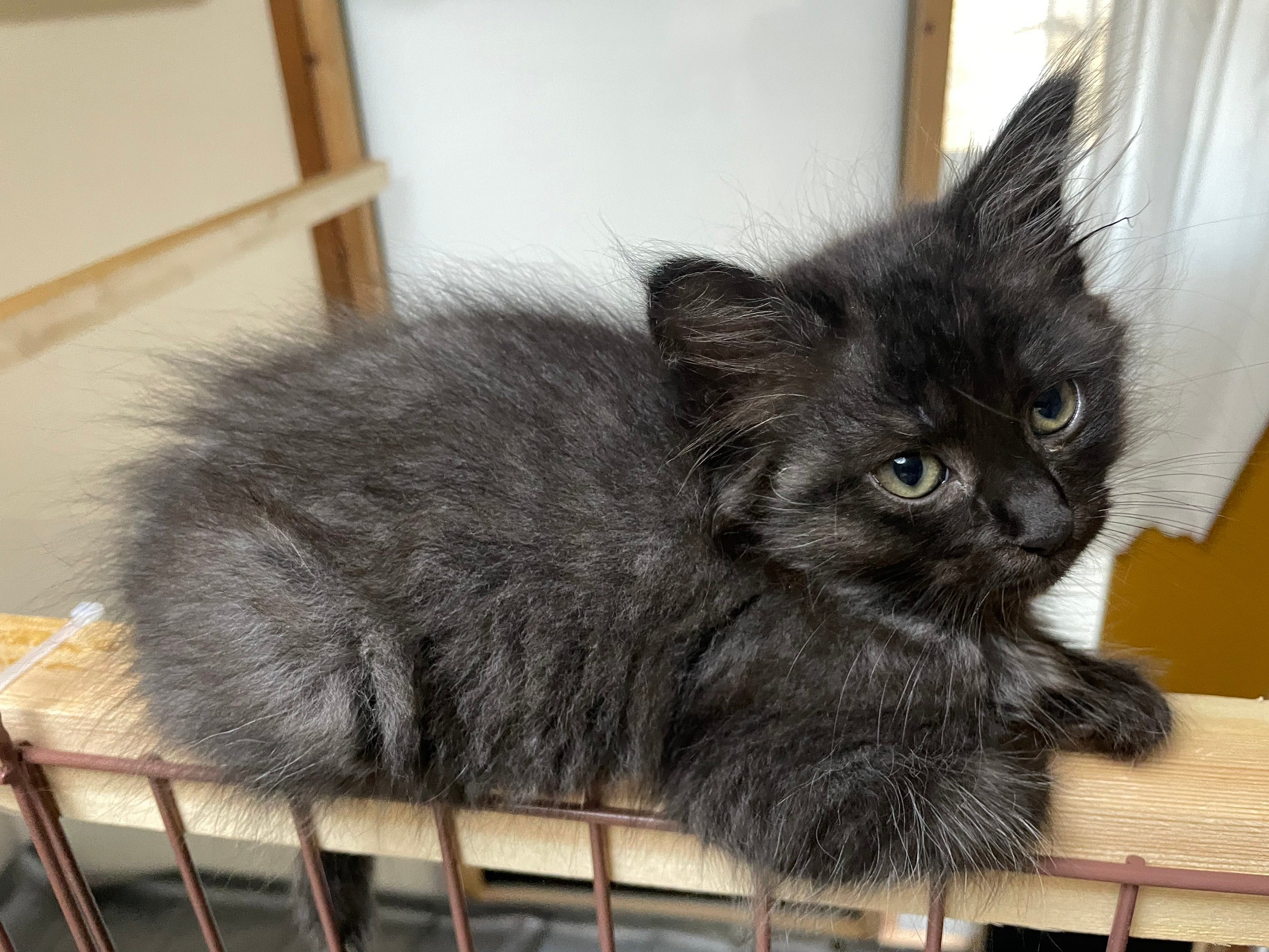 陽気でマイペース。いつもみんなに癒しを与えてくれるお茶目な女の子です。毛は長毛で、ふわふわしています。真っ黒ではなく、少し場所によっては、グレー色も混ざっています。