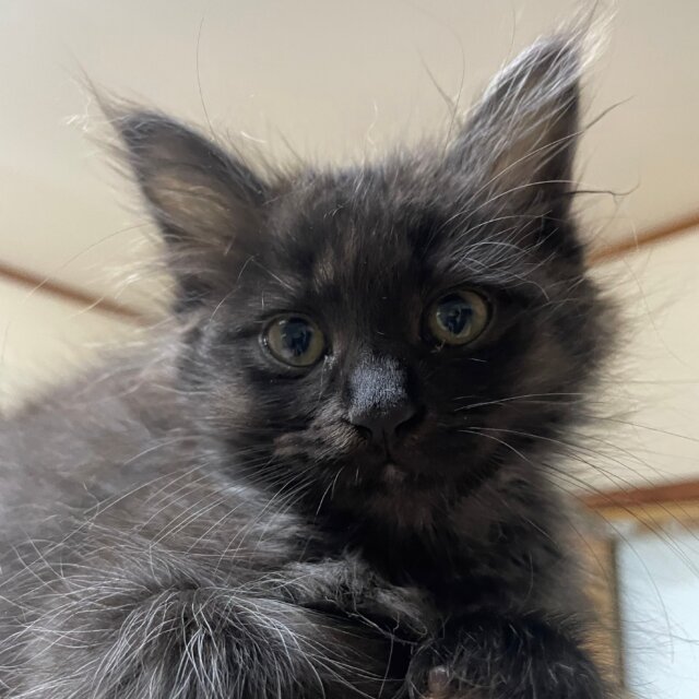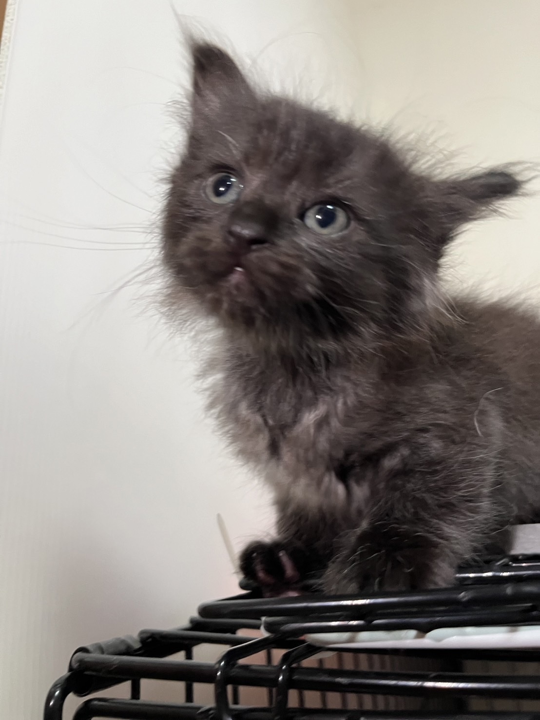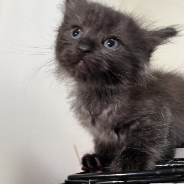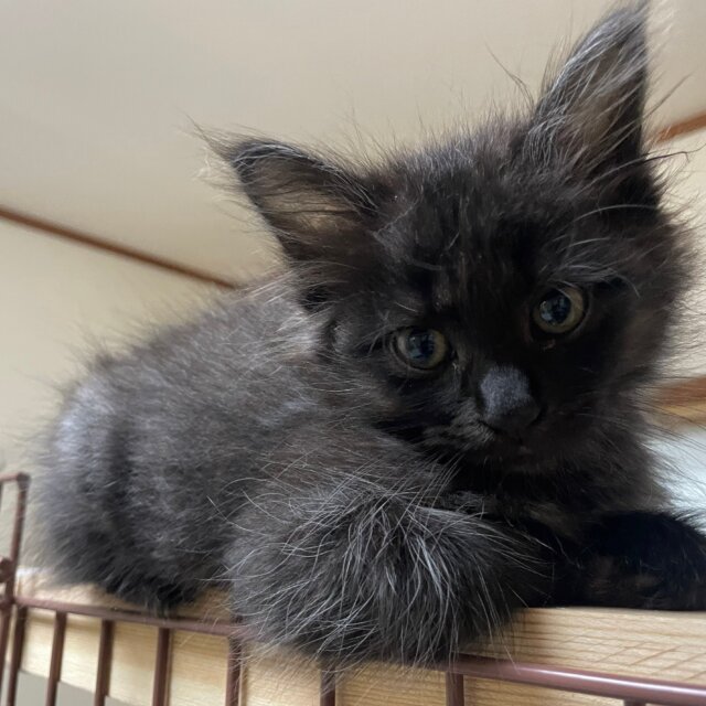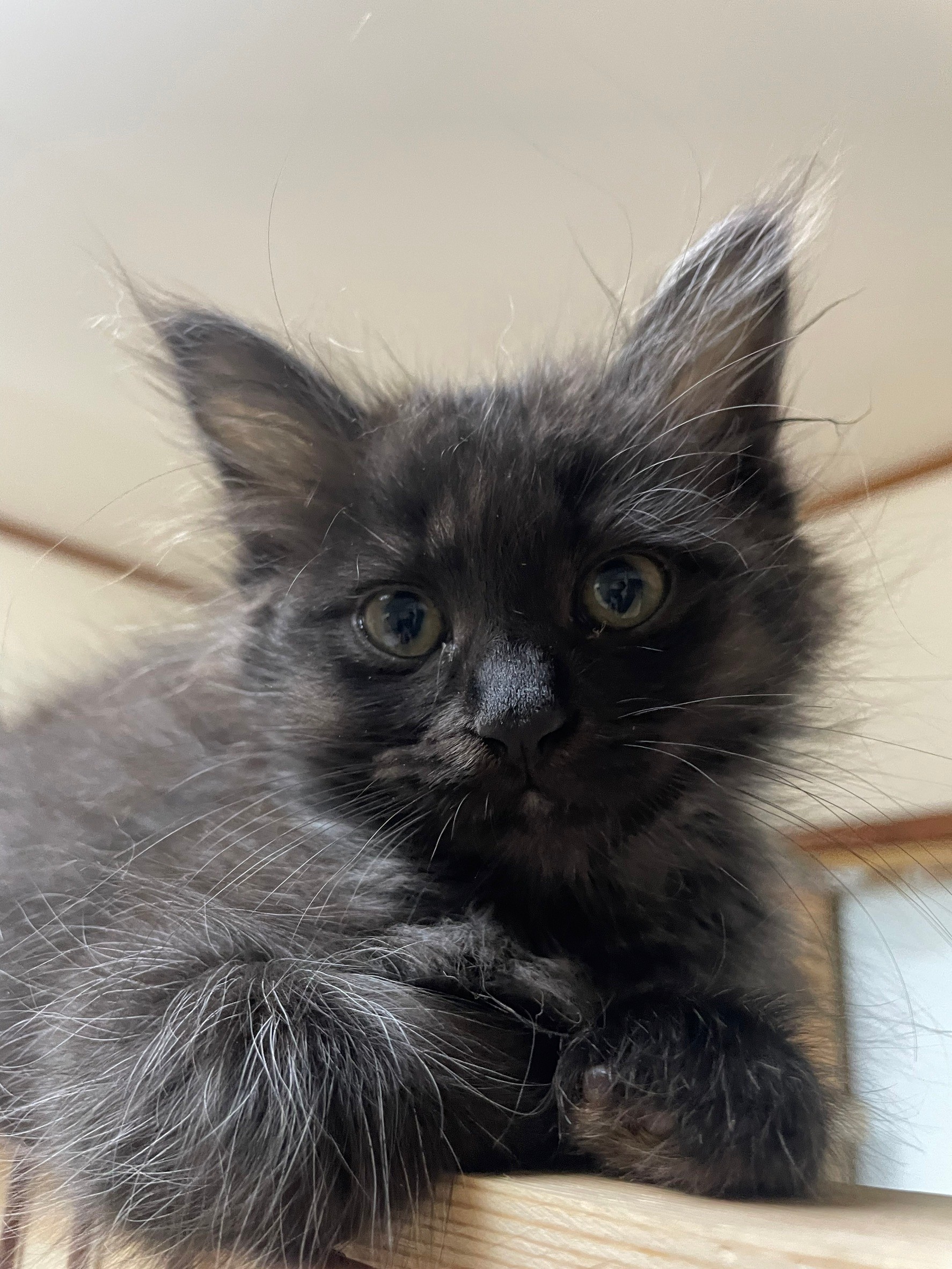 陽気でマイペース。いつもみんなに癒しを与えてくれるお茶目な女の子です。毛は長毛で、ふわふわしています。真っ黒ではなく、少し場所によっては、グレー色も混ざっています。
