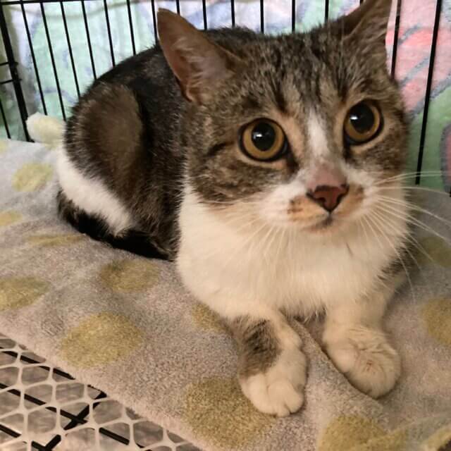 キジシロの女の子、お口周りの柄がハート型に見えてまん丸お目目もクリクリ、とってもかわいいです。性格はおとなしく、保護した直後から触れました。食欲旺盛、元気です。