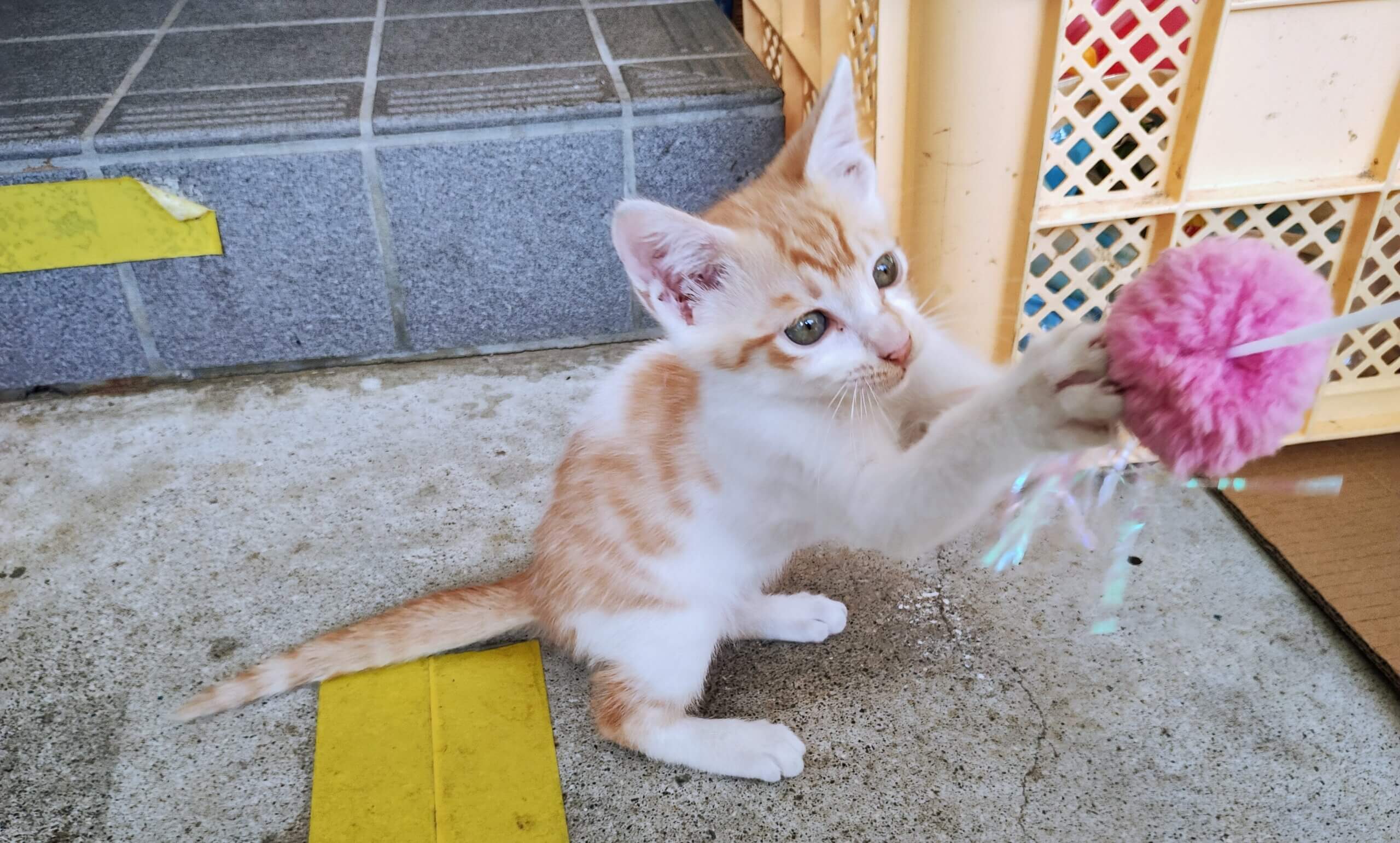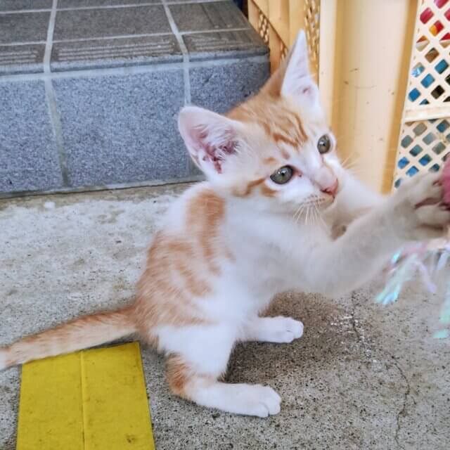 私とおもちゃで遊んだり、姉妹猫達と一緒に元気に遊んでいます。