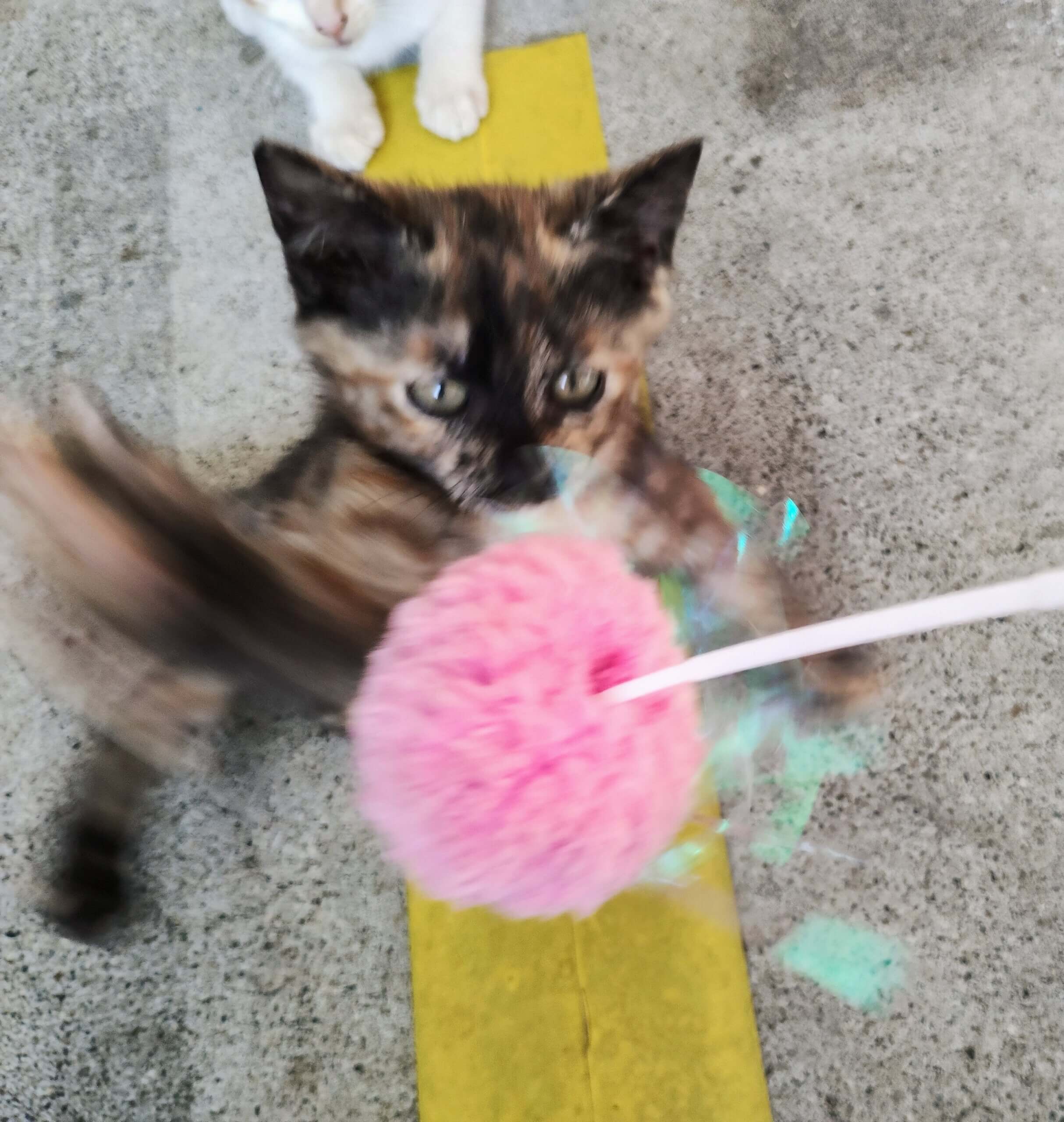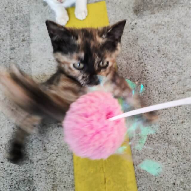 私とおもちゃで遊んだり、兄妹猫達と元気に遊んでいます。