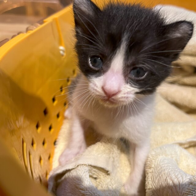 生後約2週間頃に、外で親猫もおらず一人ぼっちでいたところを保護しました。