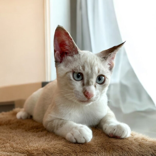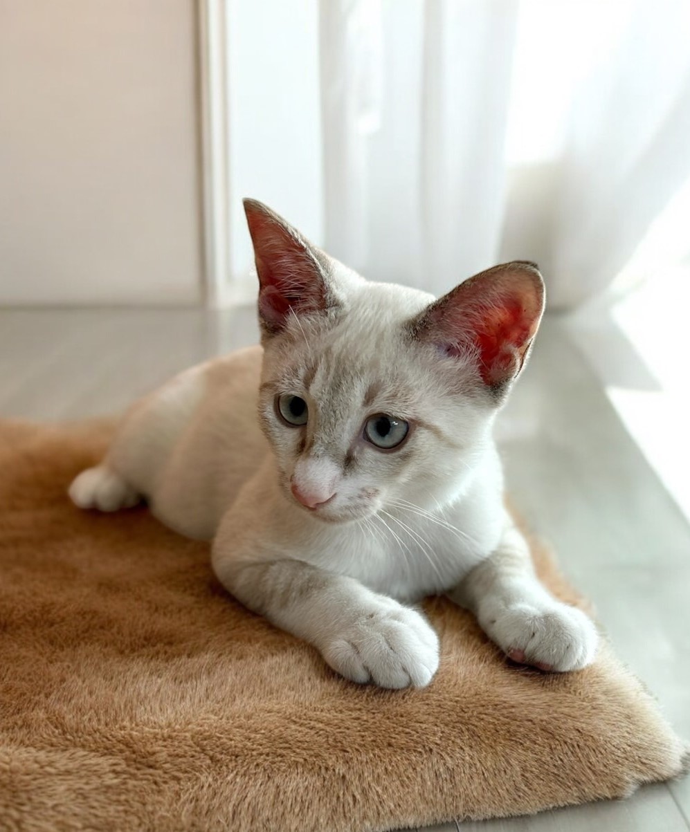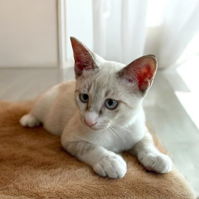 お風呂に入って、ノミダニ駆除をしたところ、綺麗なクリームの毛並み★★まだ仔猫ですので、お留守番の時間は少ないお家が嬉しいです。