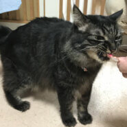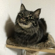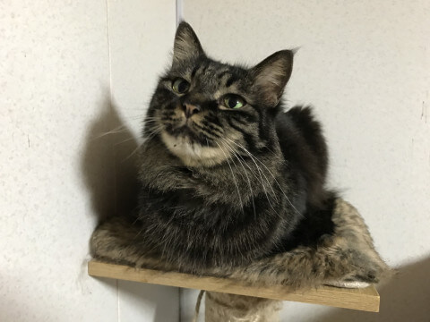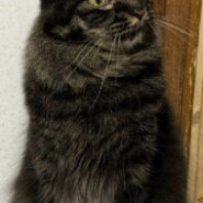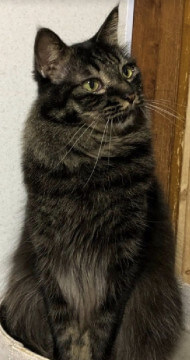 顔はキジトラ風ですが、背中は黒くツヤツヤしている中毛ふわふわの猫です。