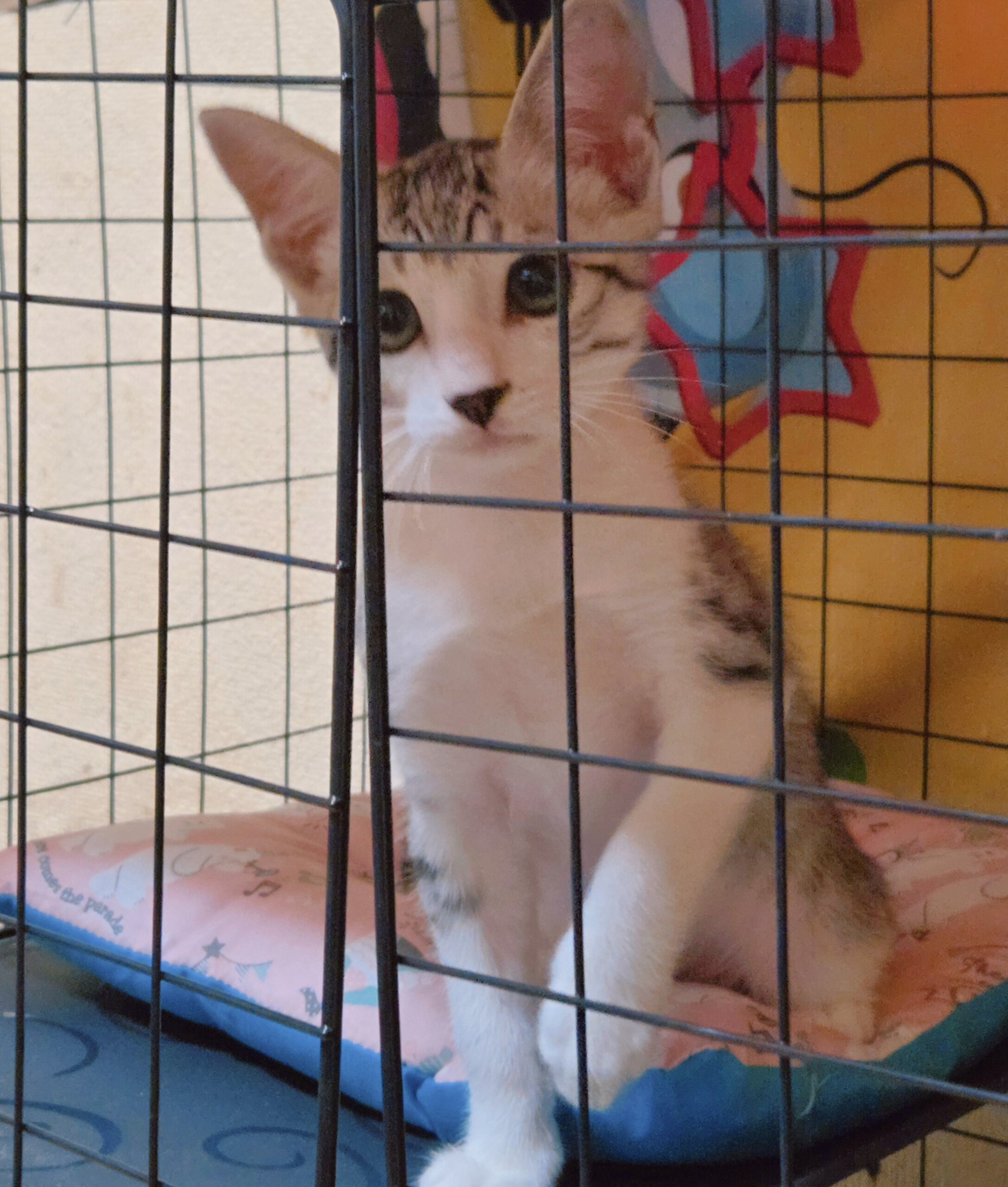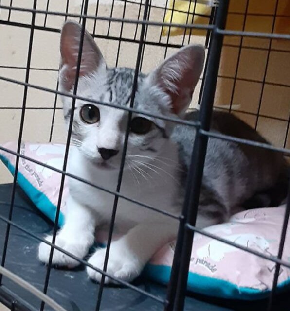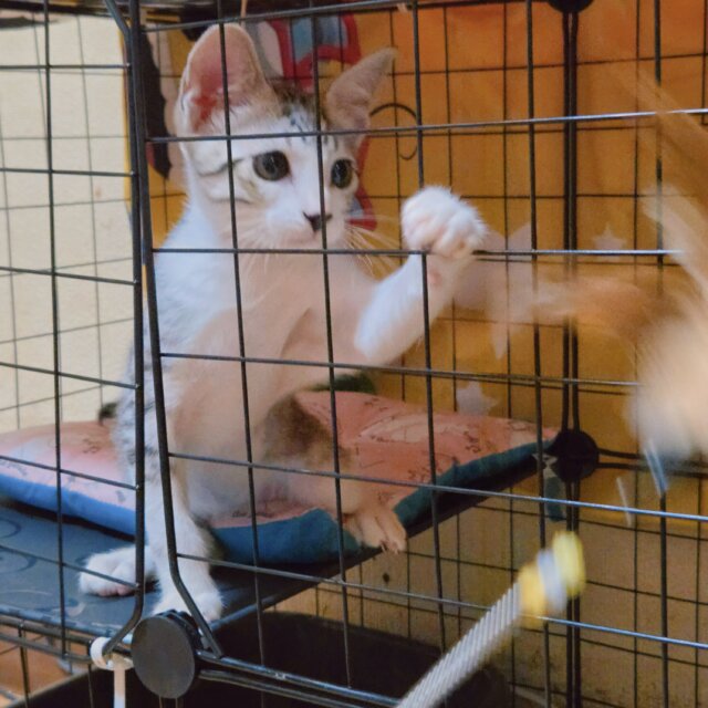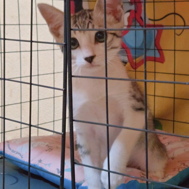 捕獲器での保護だったので怖がらせてしまい、初めての人にはカチコチ、シャー!と言ってしまいますが、譲渡させてもらってこの子の兄弟達はみんな慣れているので、すぐ慣れてくれると思います。