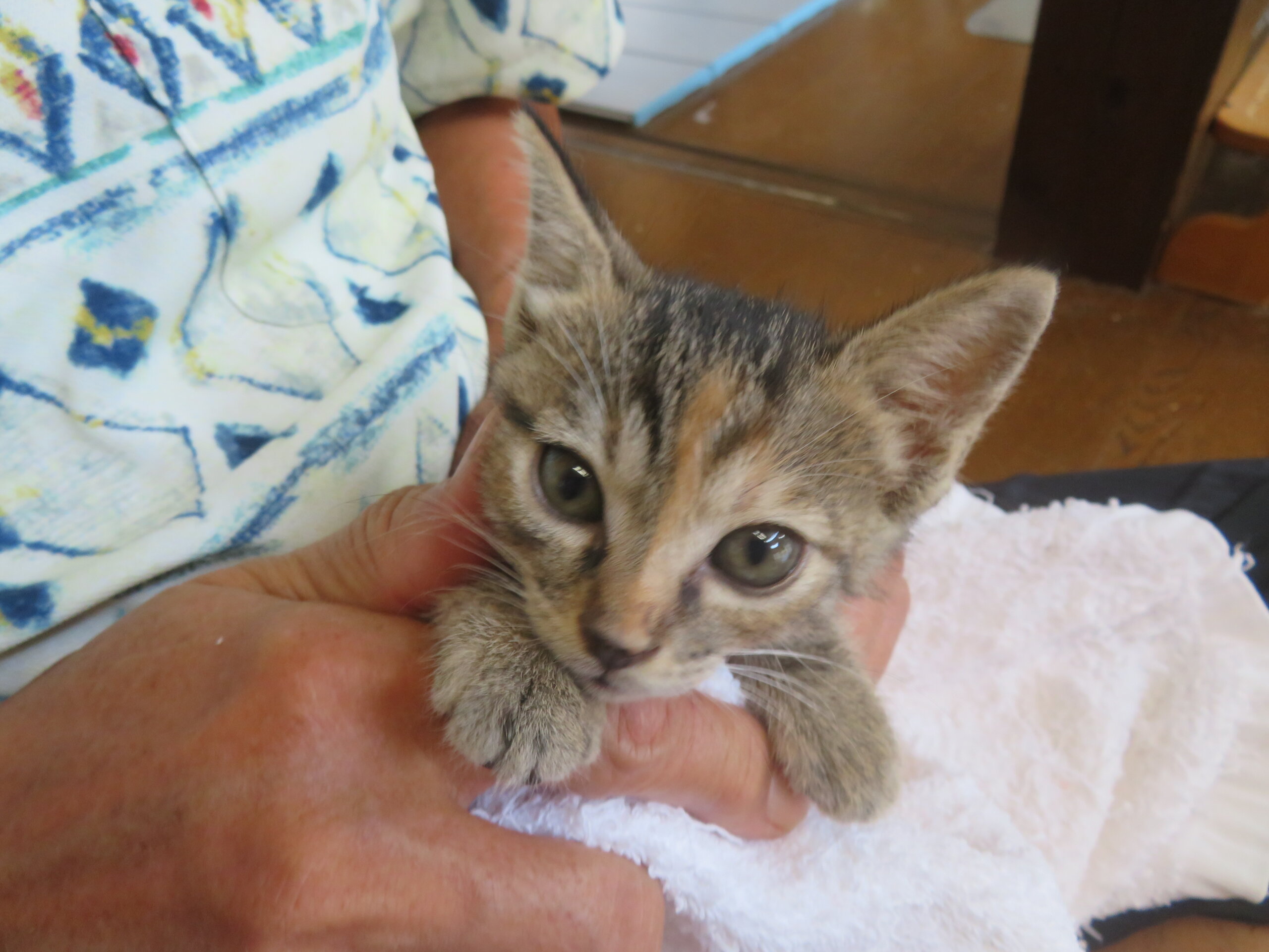「物置に猫の赤ちゃんがいて1日経過しても母猫が迎えに来ない」と住民からのSOSがありました。低体温で衰弱した赤ちゃん猫をお預かりして一所懸命に育てましたが、3匹のうち1匹は発育不良で生かすことができませんでした。生き残ったミク・ミルは順調に成長しました。