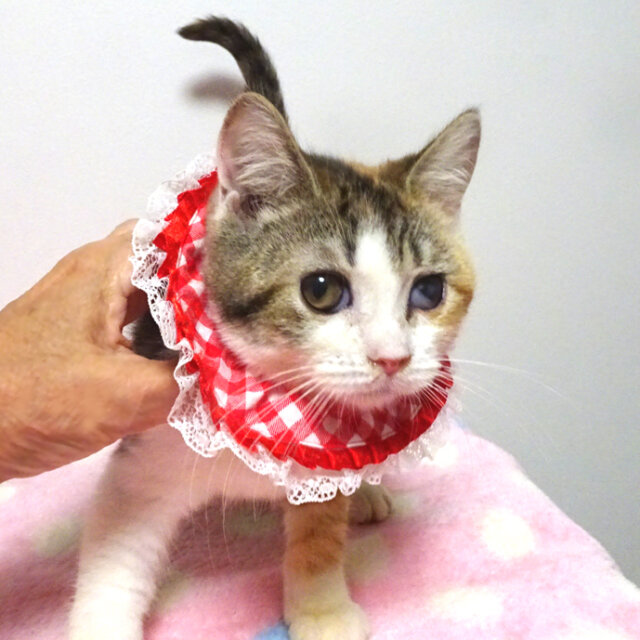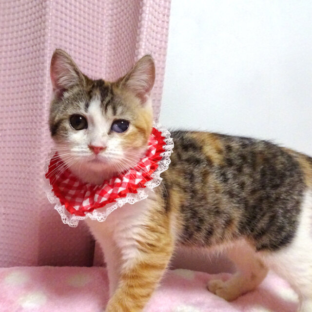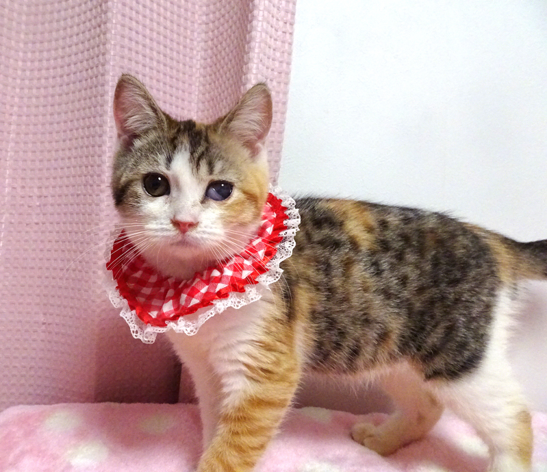 【毛色・柄】 足長マンチカン、ドット柄の三毛、長いシッポ、左目に白濁あり