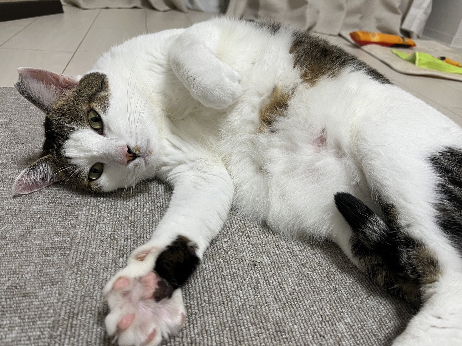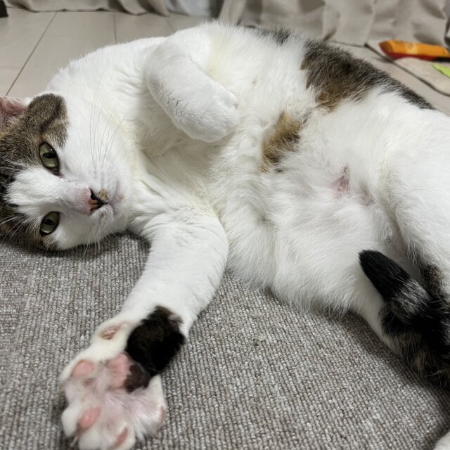 ワシャワシャ撫でられるのが好きで、ご機嫌になると手を空中でフミフミするのがとってもかわいいです。スタッフの仕事中にはお利口にしていますが、休憩中に目が合うと、「撫でて!」と言わんばかりに近寄ってきます。