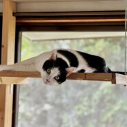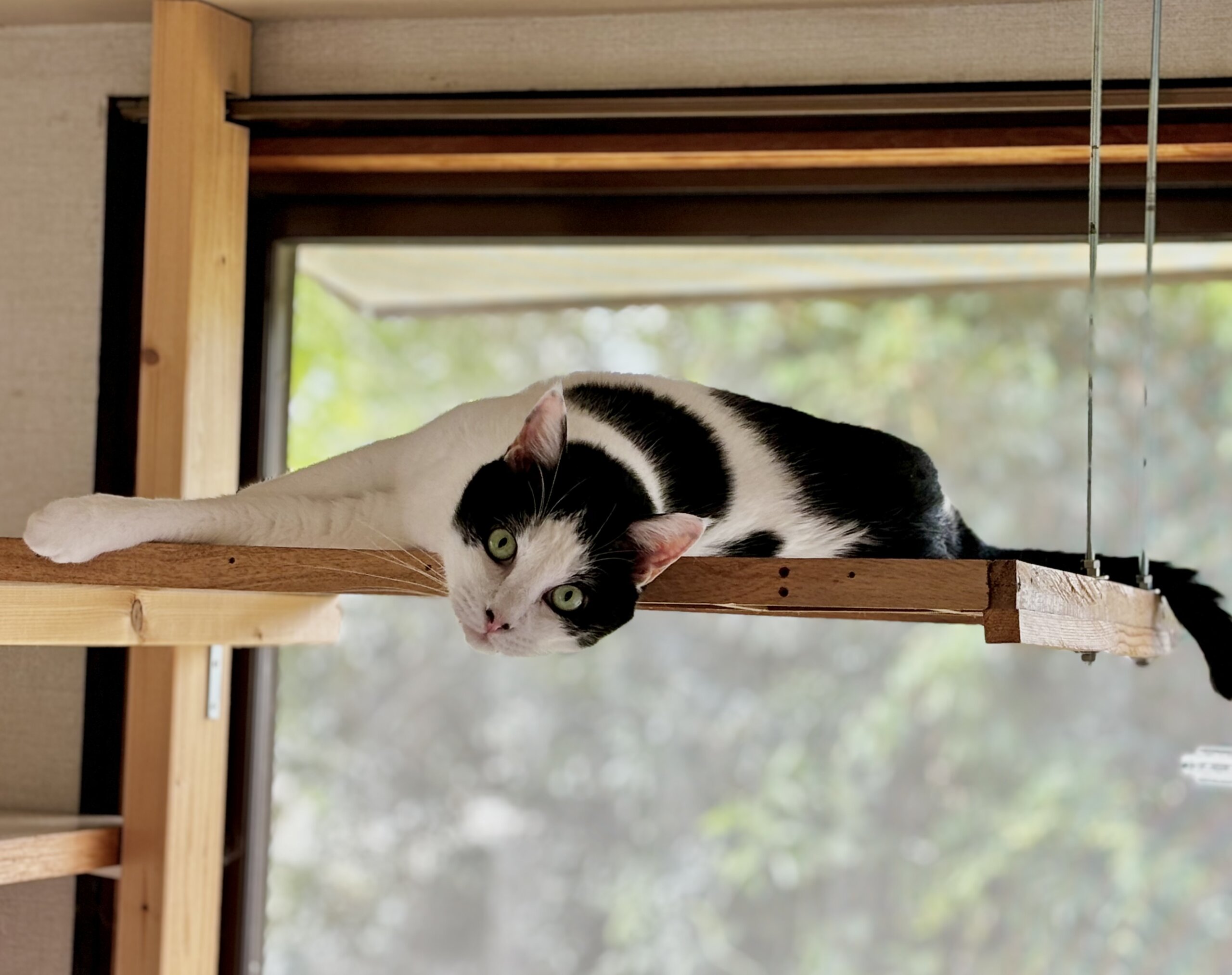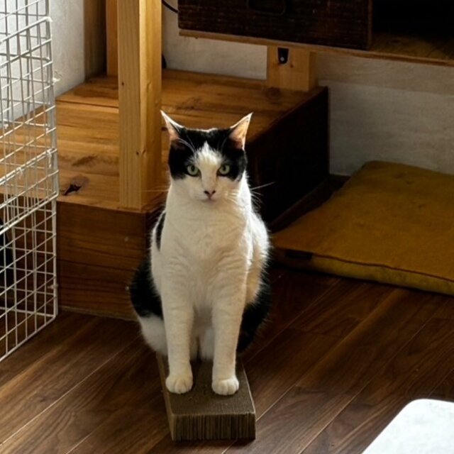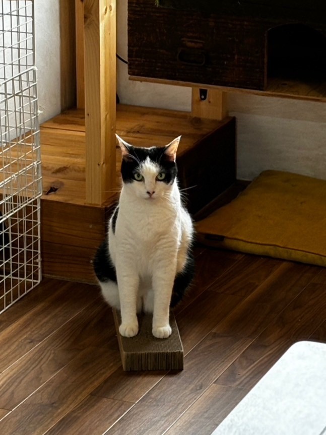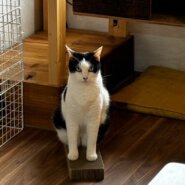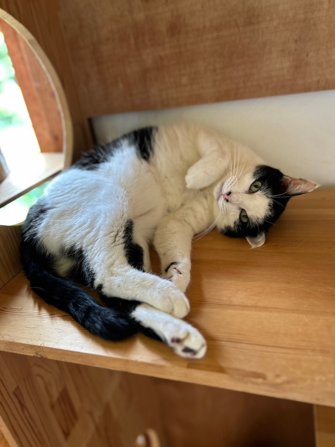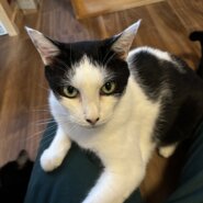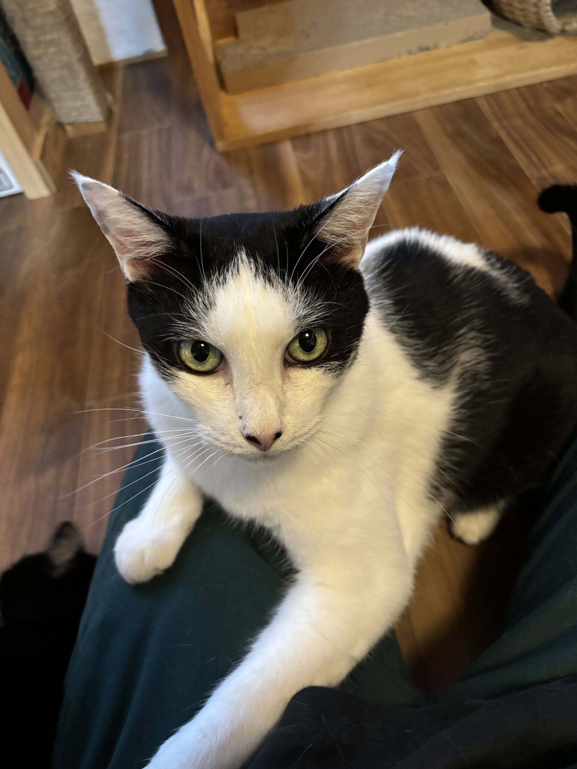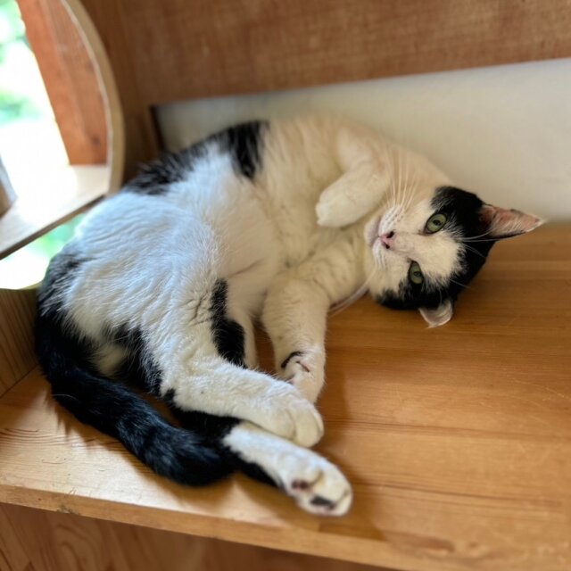 白黒短毛で長しっぽです。少し臆病なところがありますが、人が大好きで慣れると膝の上に乗ってきたり、すり寄って常に近く居ようとします。他猫にも友好的です。牙が出ていて、甘えてくる時にヨダレがたれていることがしばしばあります。