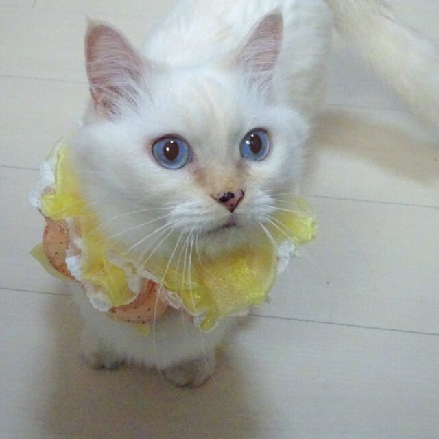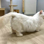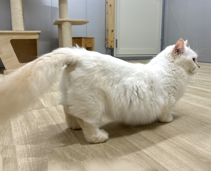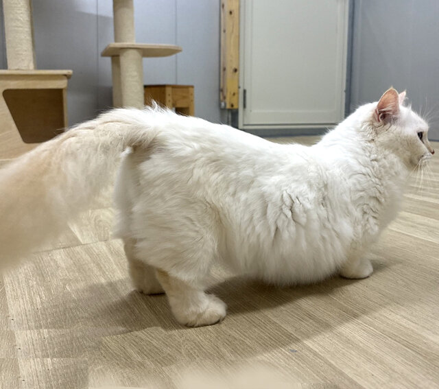 【毛色・柄】 マンチカン、きれいな青い目、白とクリーム(耳、鼻、シッポ)、ゴージャス長いシッポ