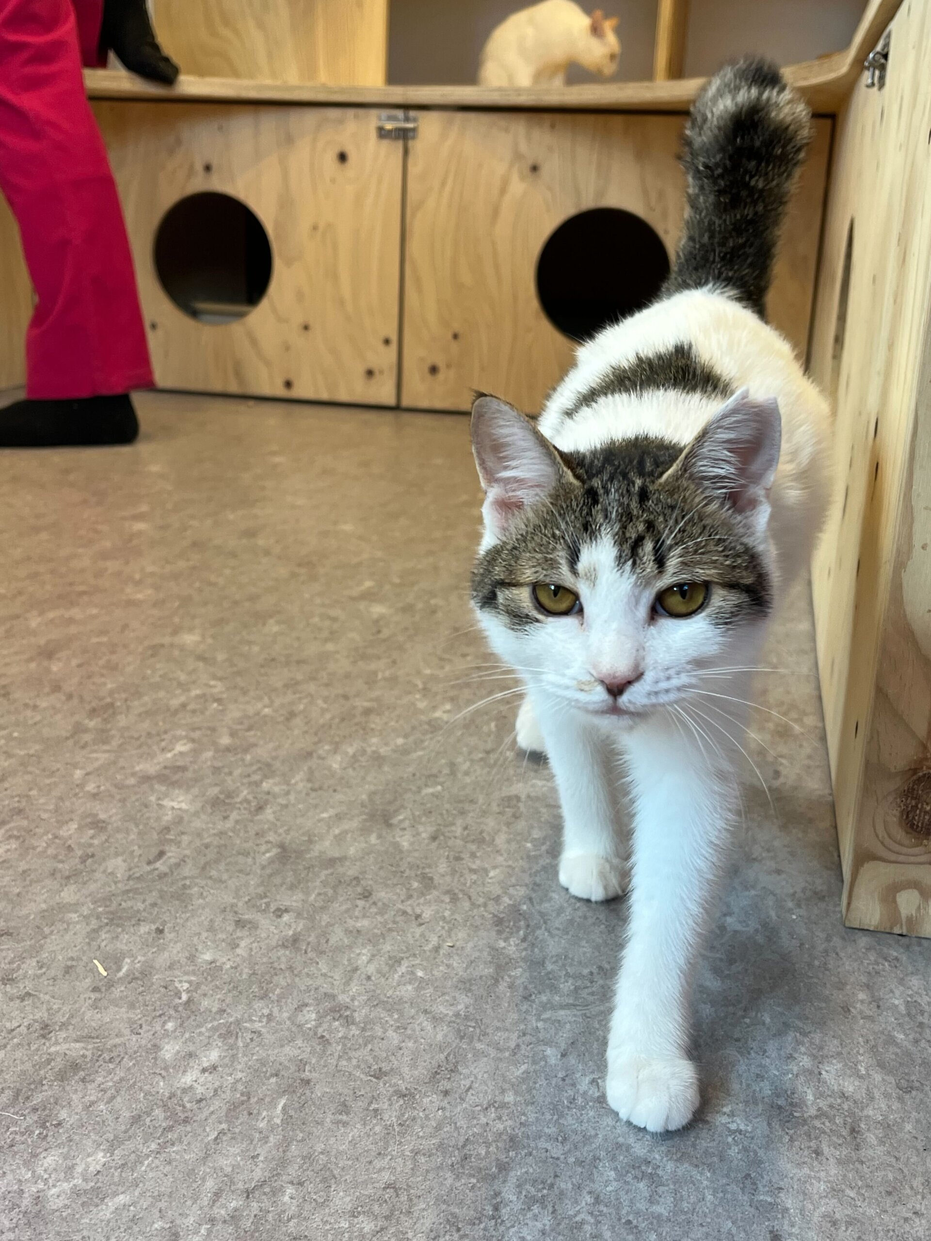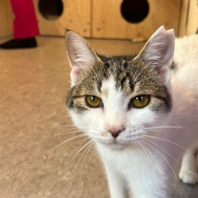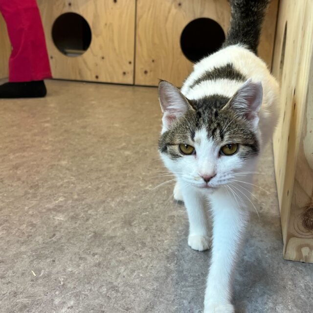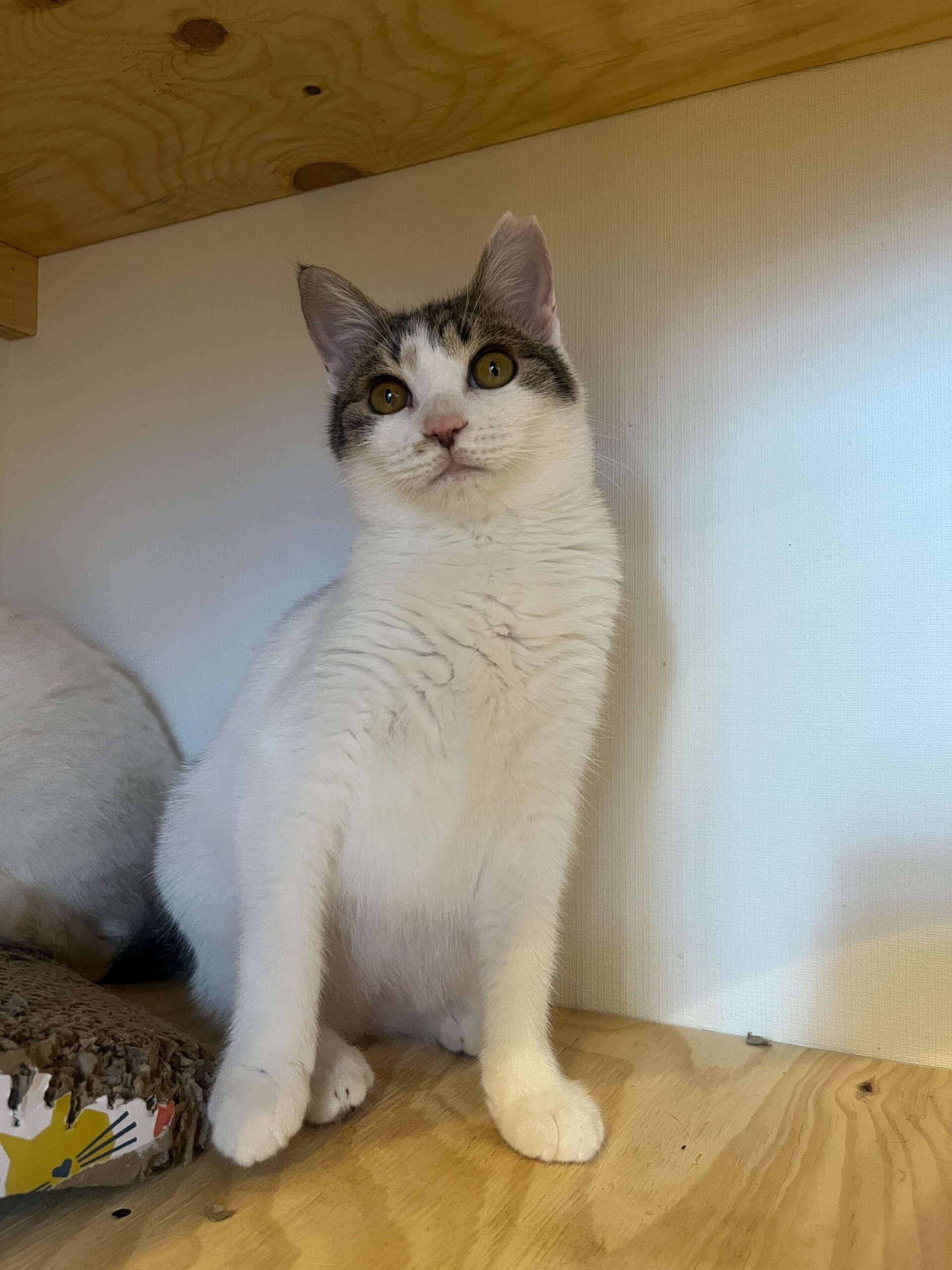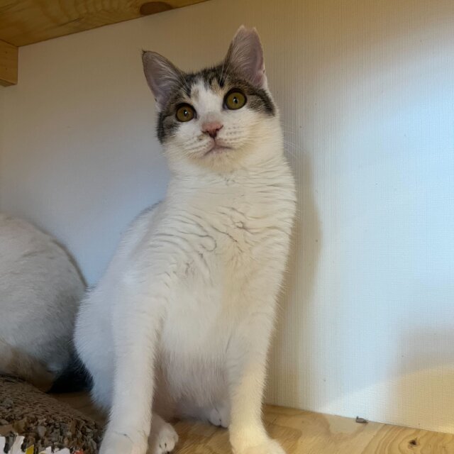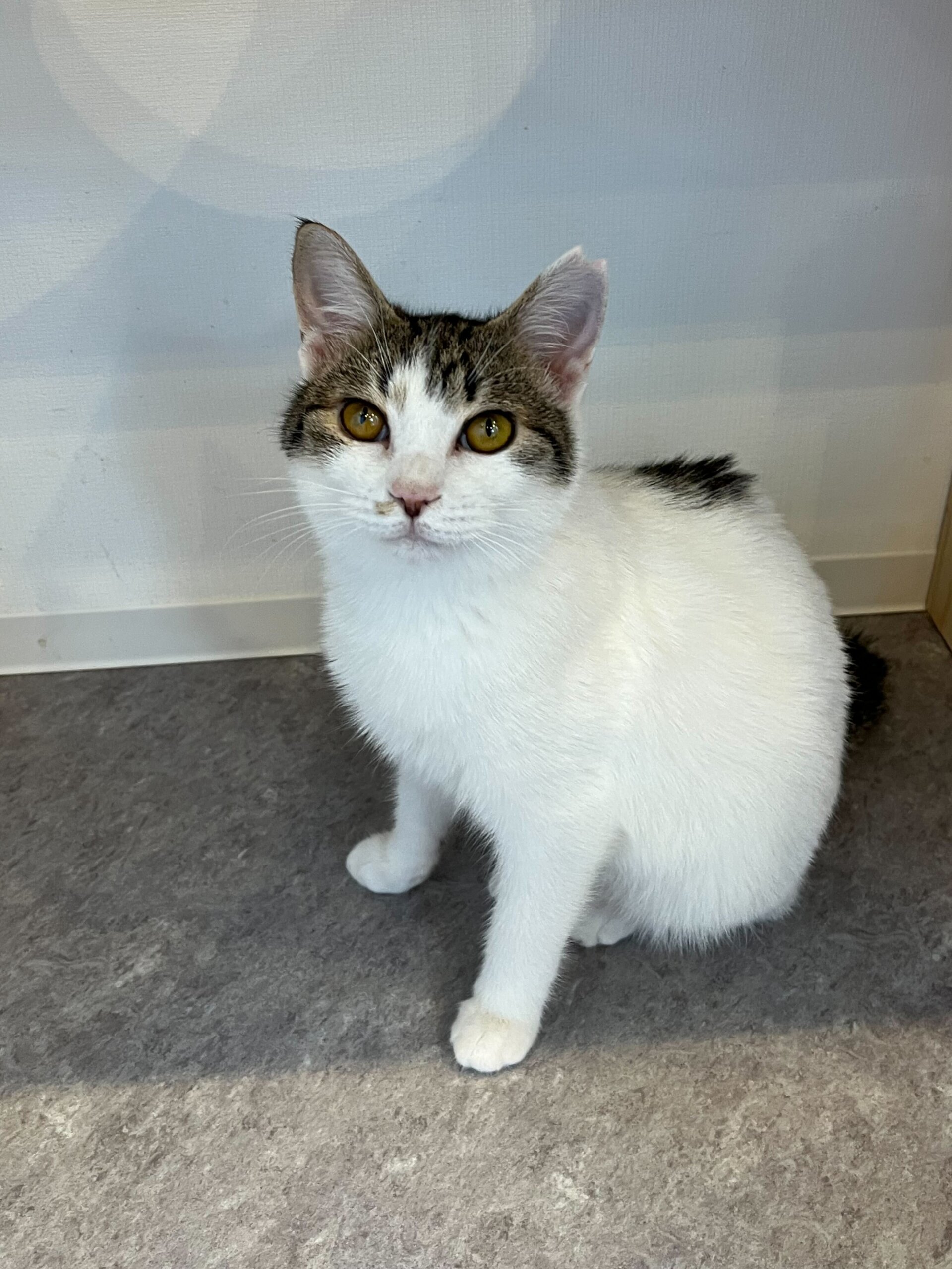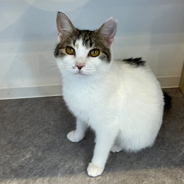キジ白でしっぽは短め、ずんぐりむっくりした体型が可愛いです。