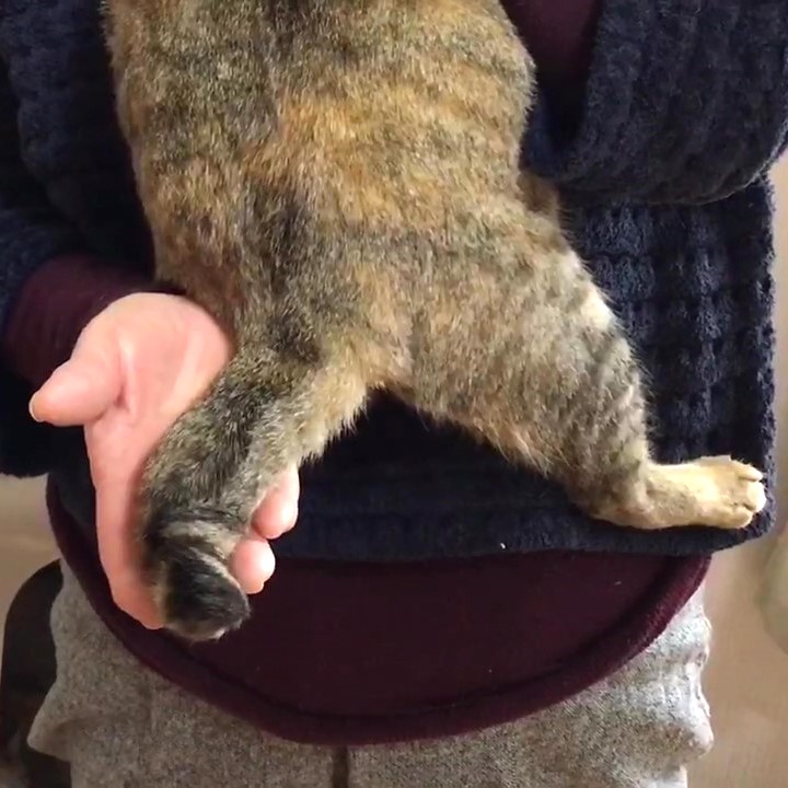 尾っぽは短くて、髭は長めのキジトラ柄です