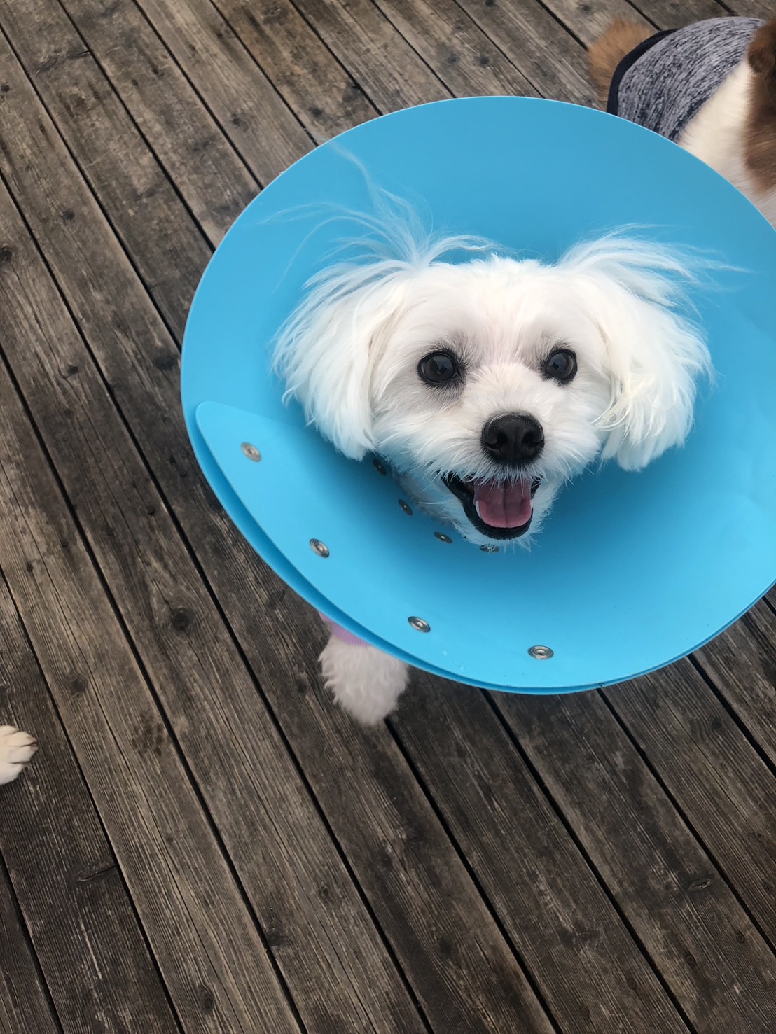 この子はアレルギーがあるかも!?と病院の先生に言われています。今は前足をガジガジして真っ赤になるのでエリカラーを付けています。この子は缶詰めしか食べません。今はデビフの成犬のお食事という缶詰めを少しずつ口まで持っていって最初はペッと吐き出しますがあとは手であげて自分で食べるようになります。里親様になられた方は1度病院に連れて行って頂きたいと思います。お腹の皮膚が乾燥する為、朝、夕と犬用の保湿スプレーを付けています。
