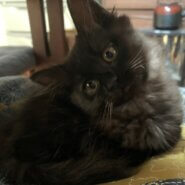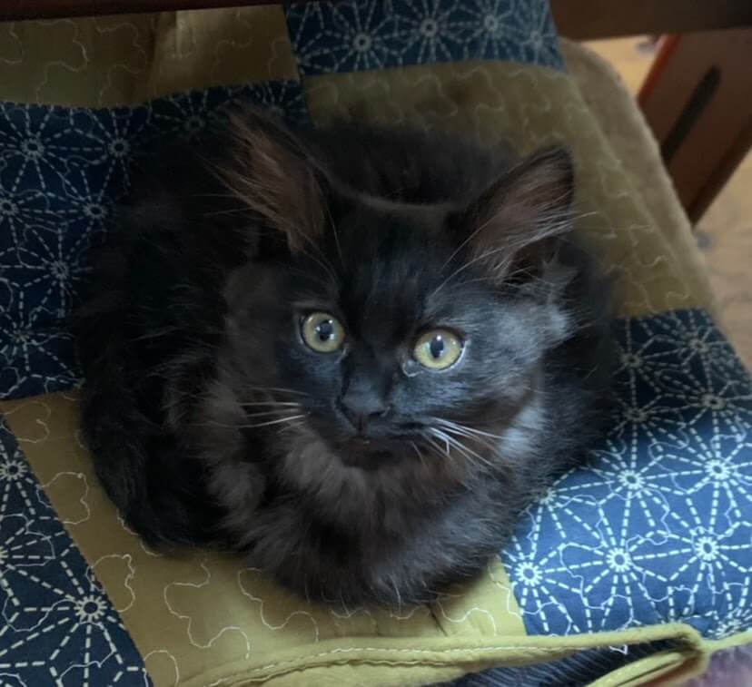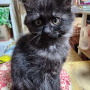 黒猫メスやや長毛で胸辺りにグレーか入っています。