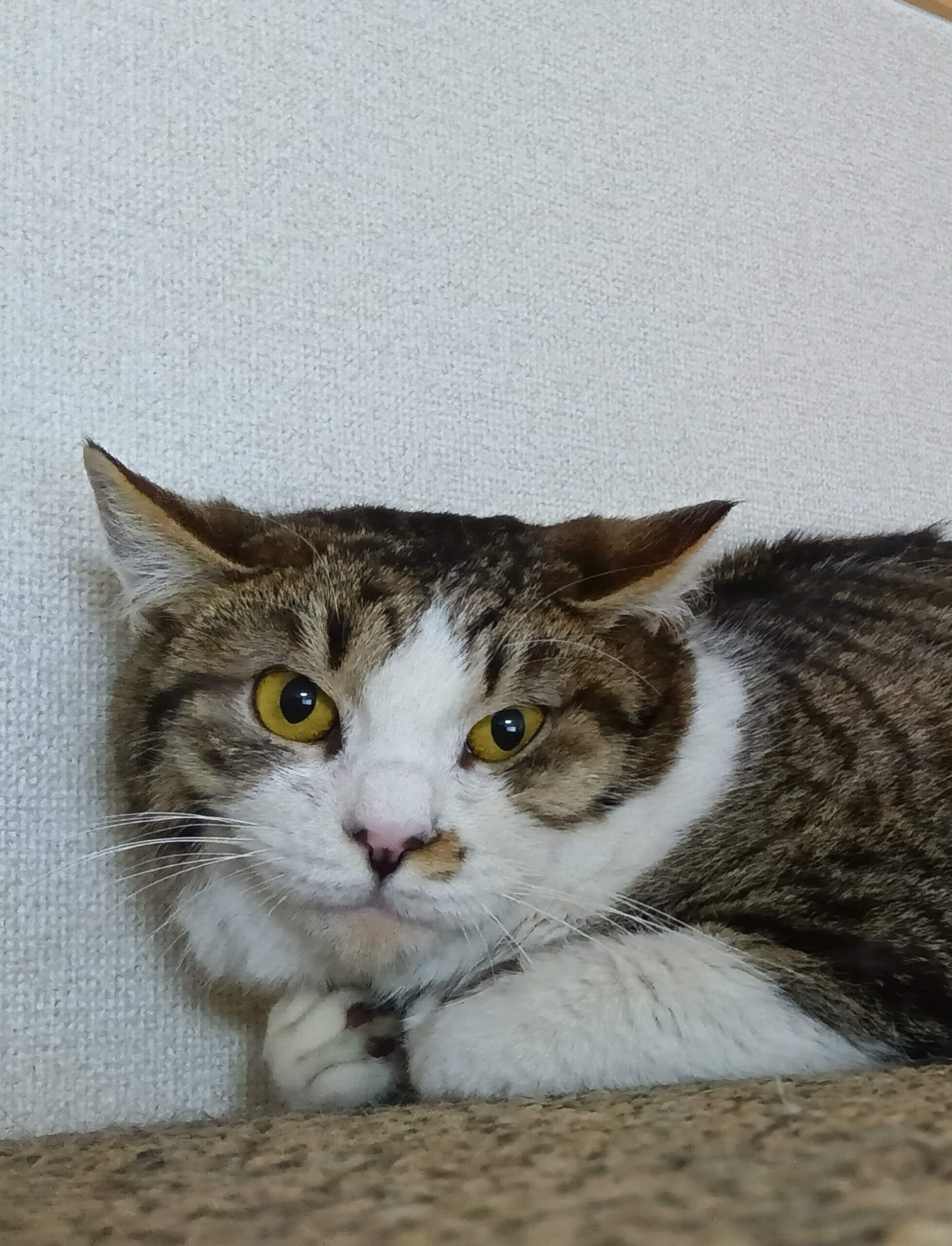 母猫が早くに育児放棄したらしく、兄妹ふたりが片時も離れずに餌を求めて地域を走り回っていました。初めての冬を迎え、ある日突然この妹の顔を変貌してその後、兄も目ヤニと鼻水、咳をしていることに気づきました。病院で診察してもらうにもその後のことを町内会の会長に町内で里親募集してほしいと何度もお願いしましたが、一向に動いてもらえませんでした。そうこうしている内に風邪の症状が進行して眼が潰れそうになってしまい、これ以上放置することができなくなり、捕獲して病院につなげました。現在は回復して元気です。