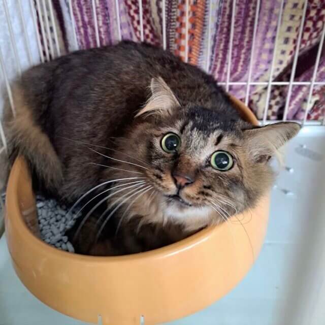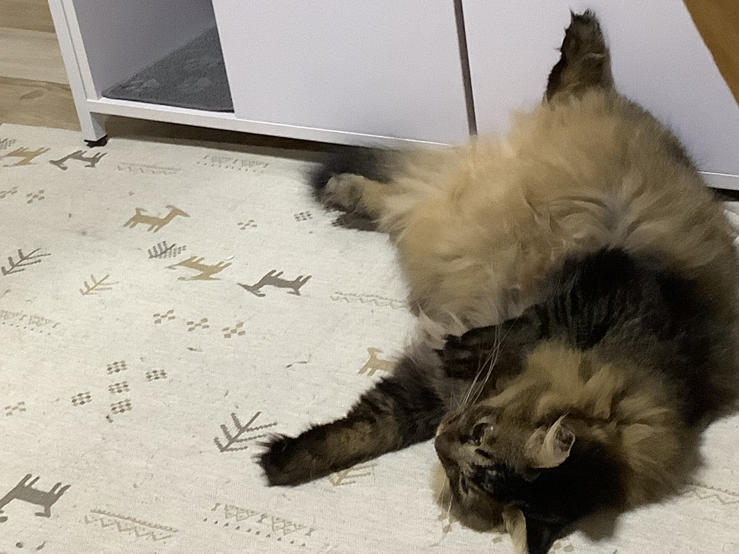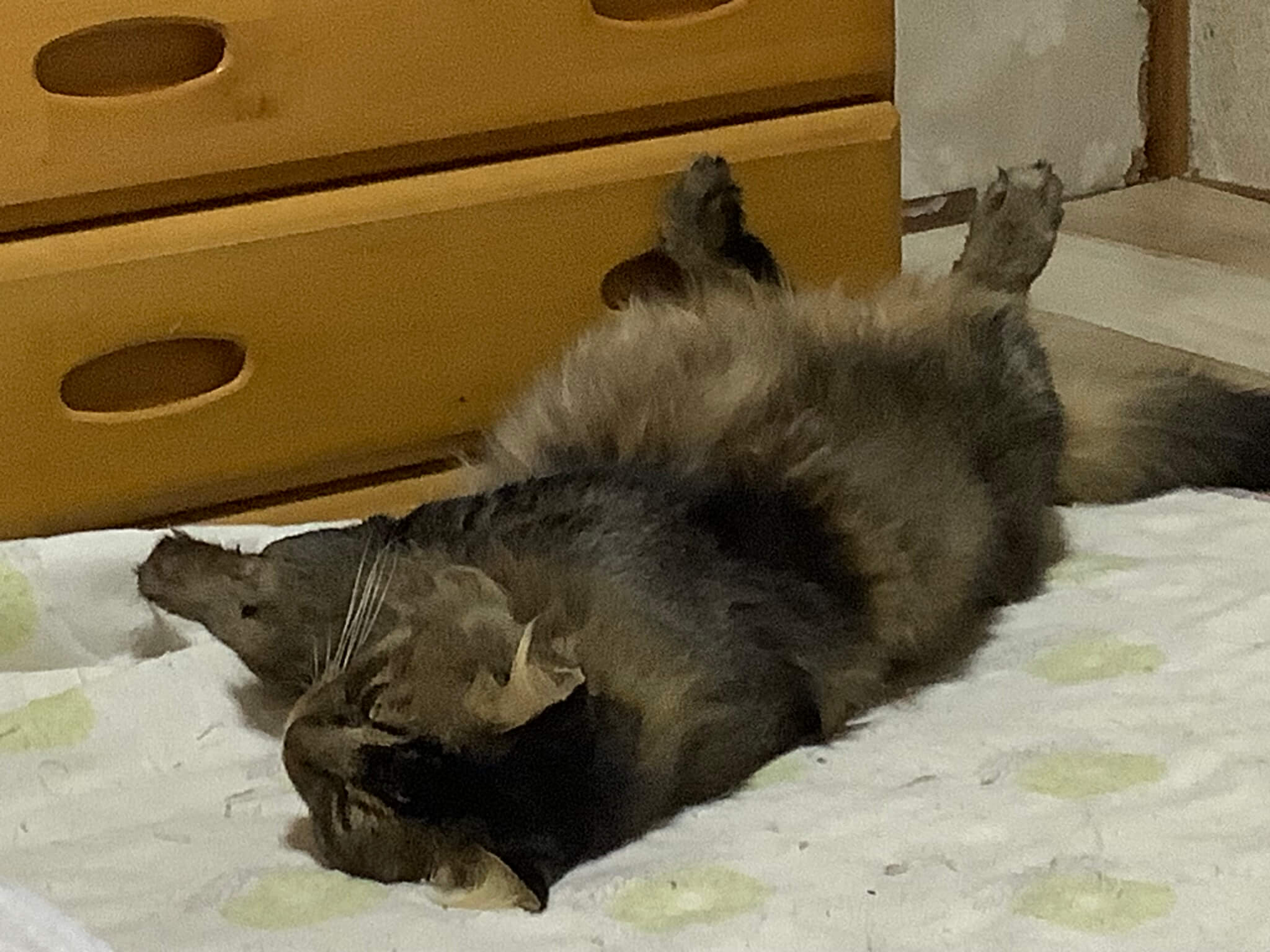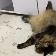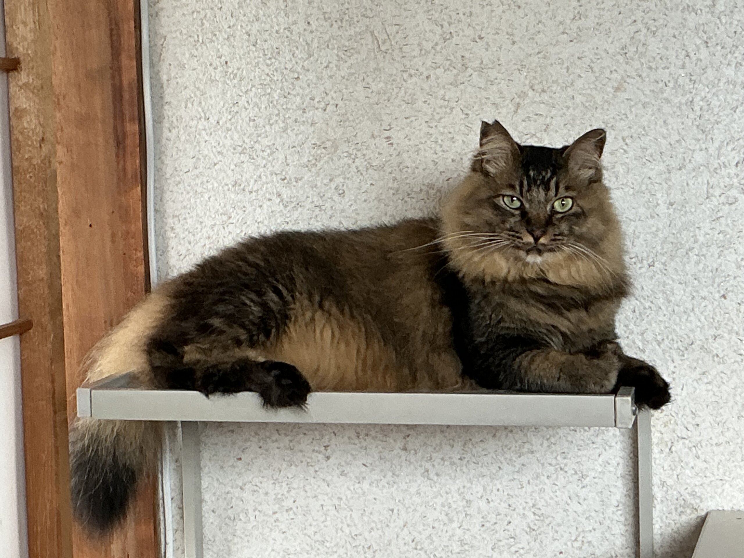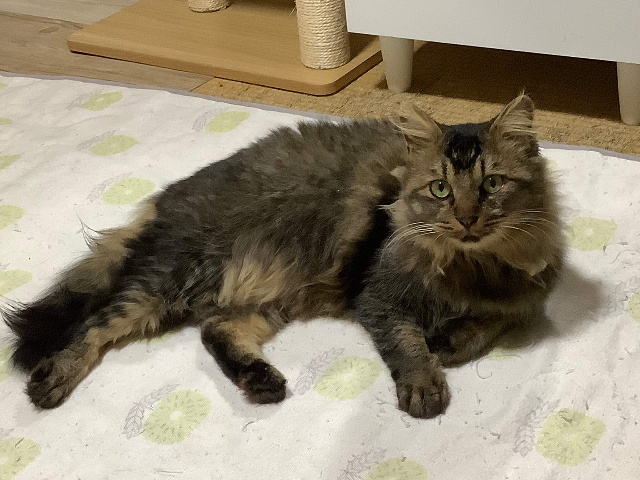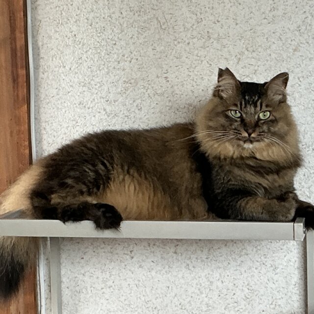 動物病院で、推定1~2歳との事。長毛キジ、体格は大きめで、しっぽもフサフサで大きいです。食欲旺盛、元気いっぱいで、スリスリの甘えんぼ君です。まだまだ若いので、たくさん遊んで、幸せな猫生にしてあげてください。