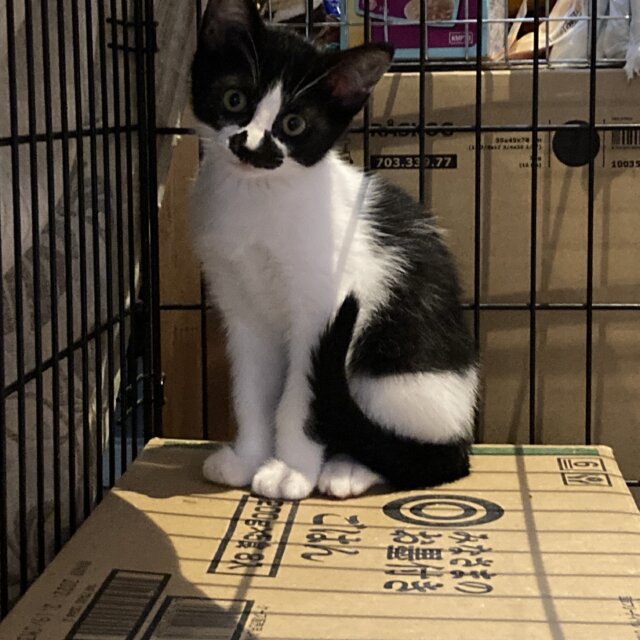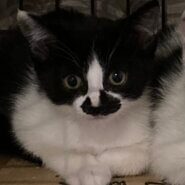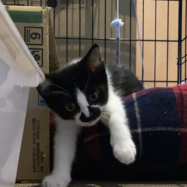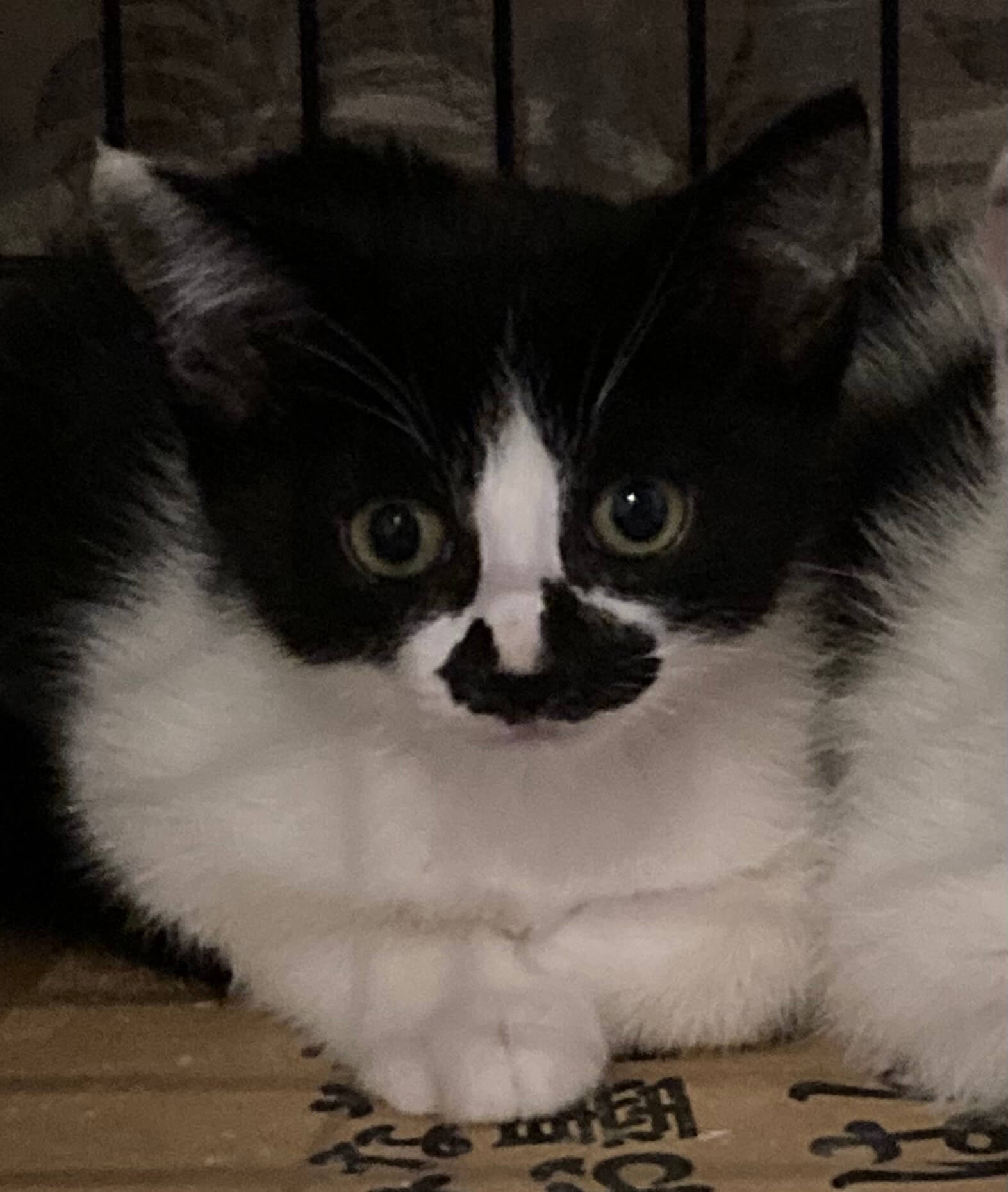 白黒ヒゲが特徴の男の子です。黒が多めで尻尾が長くまっすぐです。
