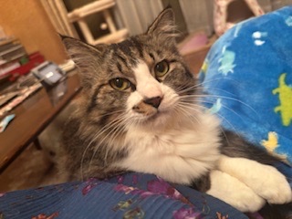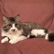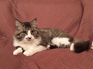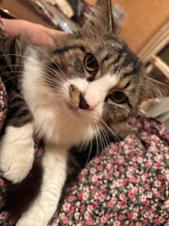 推定1歳1ヶ月くらいの長毛のキジ白男の子です。