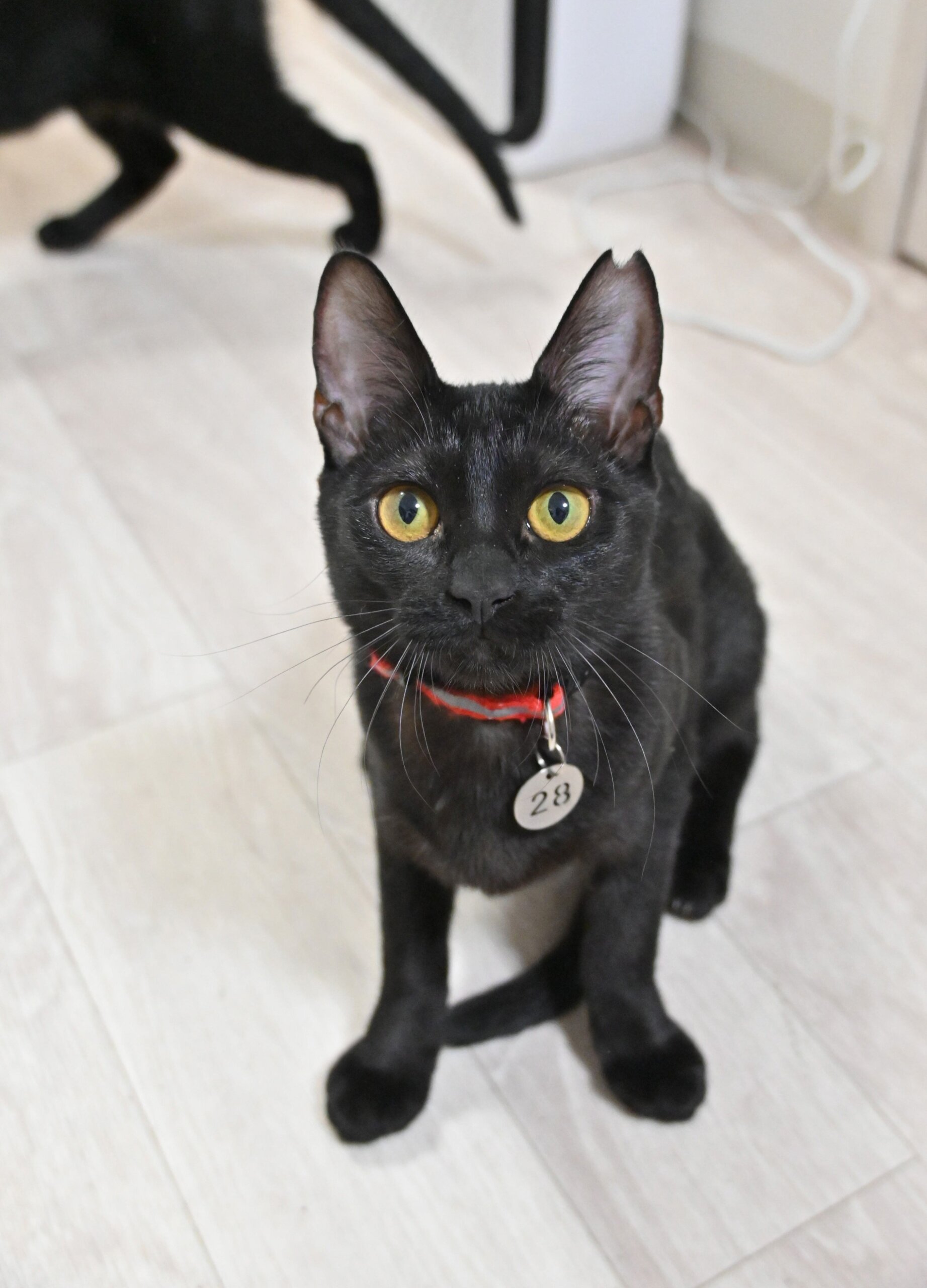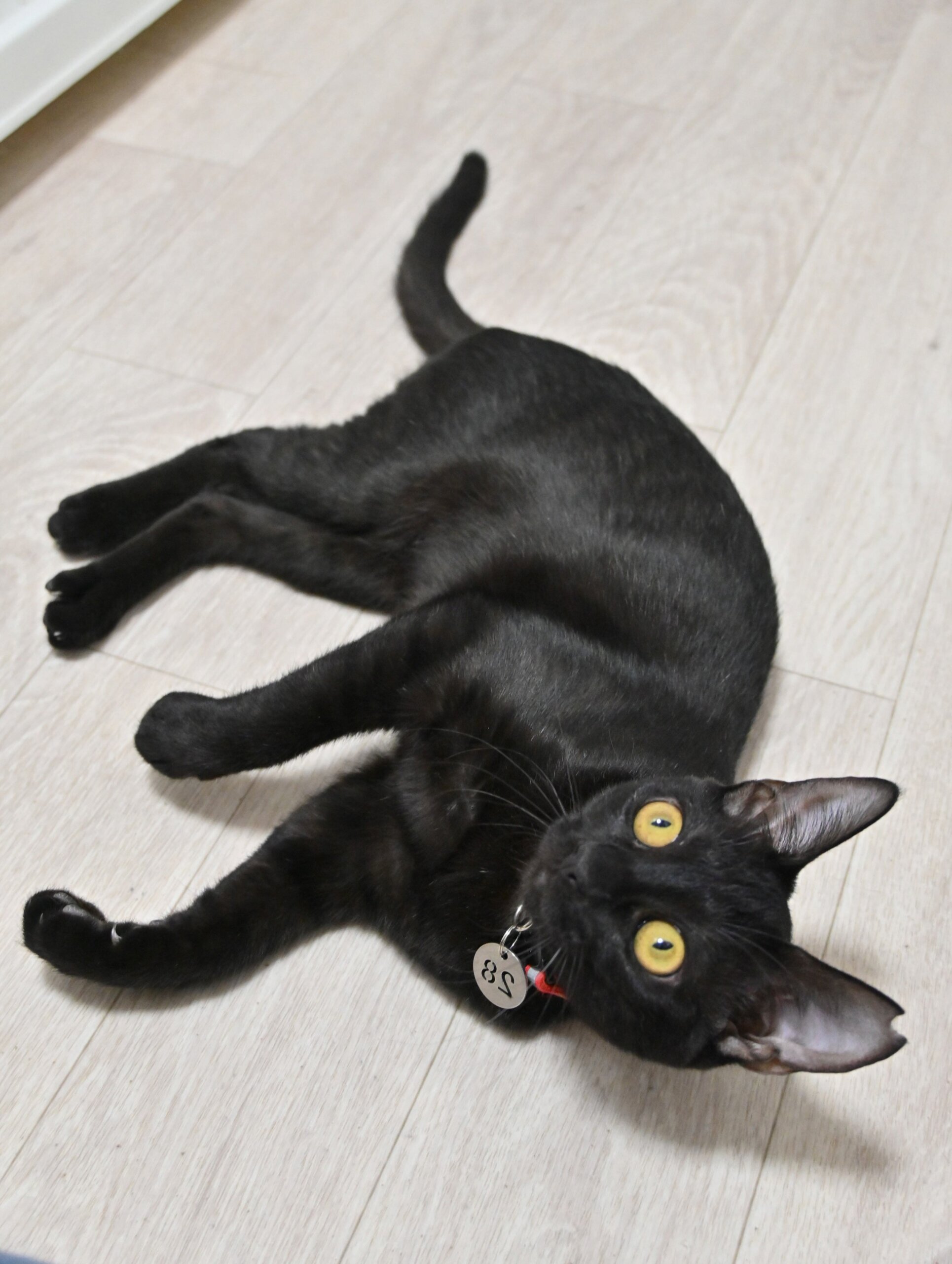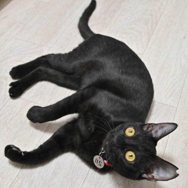やって来た時はまだ生後半年ほどの子猫で、飛鳥やきゅみに守られて一緒に過ごしていました。今はだいぶ大きくなりましたが、甘えん坊なところはそのままです。やっぱり飛鳥やきゅみが好き、おもちゃも好き、そして今では人間も大好きになりました。撫でてあげるとシートの上でゴロンゴロン、もっともっとで、きりがありません。