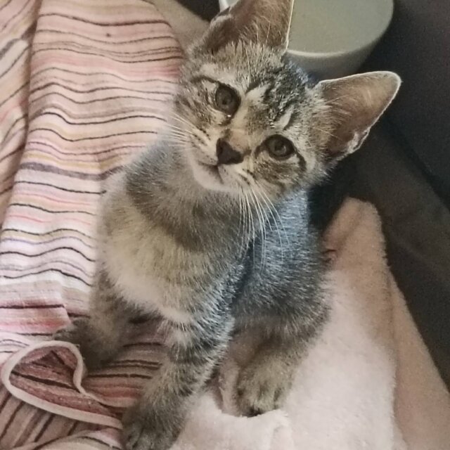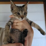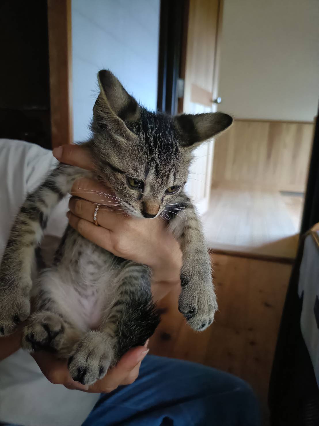 宅配ボックスに入っていました。親猫がいましたが、この酷暑で過酷な夏を乗り切れるか心配で、返すかどうか悩んだあげく、保護して病院へ連れていきました。自宅はとても狭く先住猫がいるためなかなか難しいです。涼しい中プロレスして安心して寝ています。ご検討下さると幸いです。