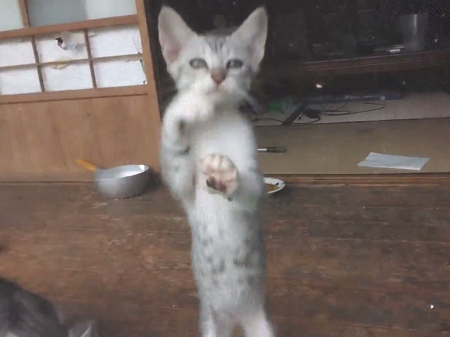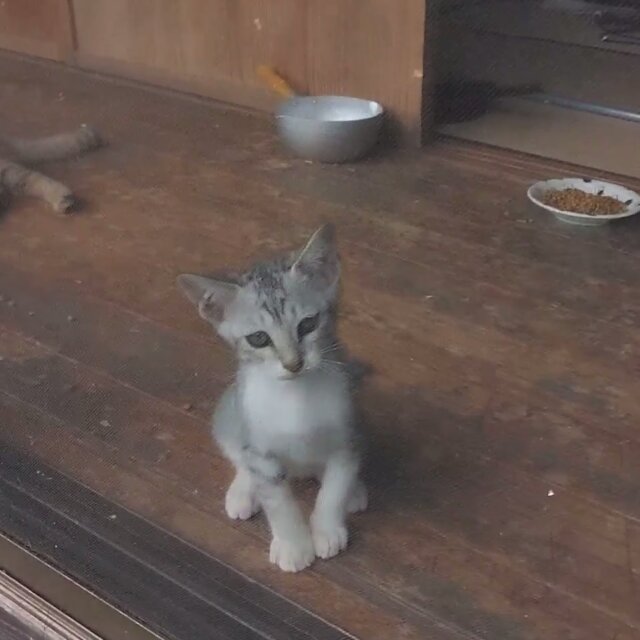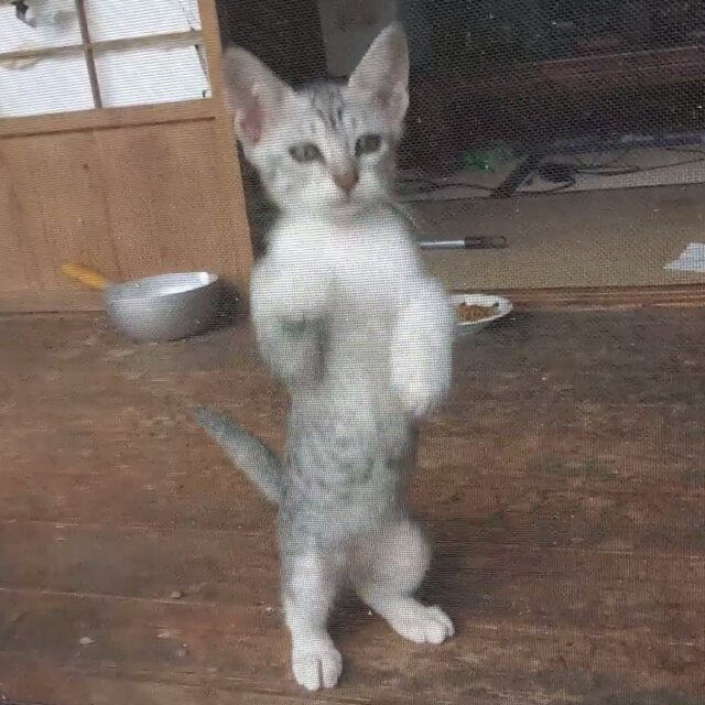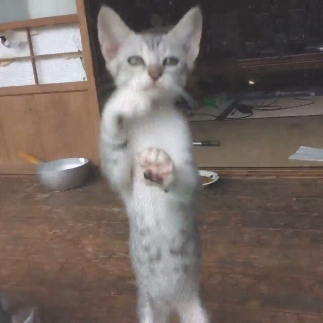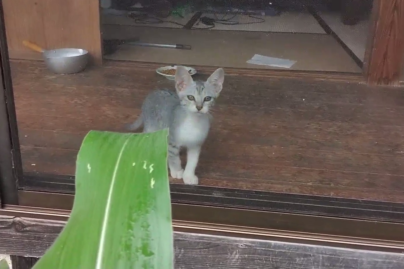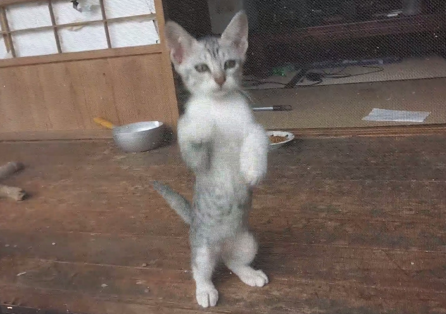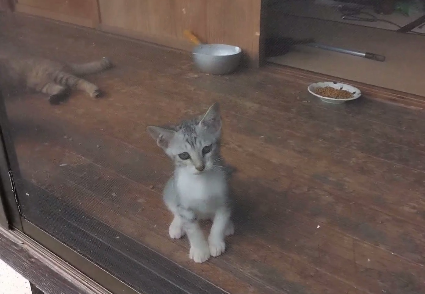 縁側で遊んでいるギンちゃんの動画です。網戸を引っ掻いたり、お姉さん猫のしっぽを追いかけ回します。