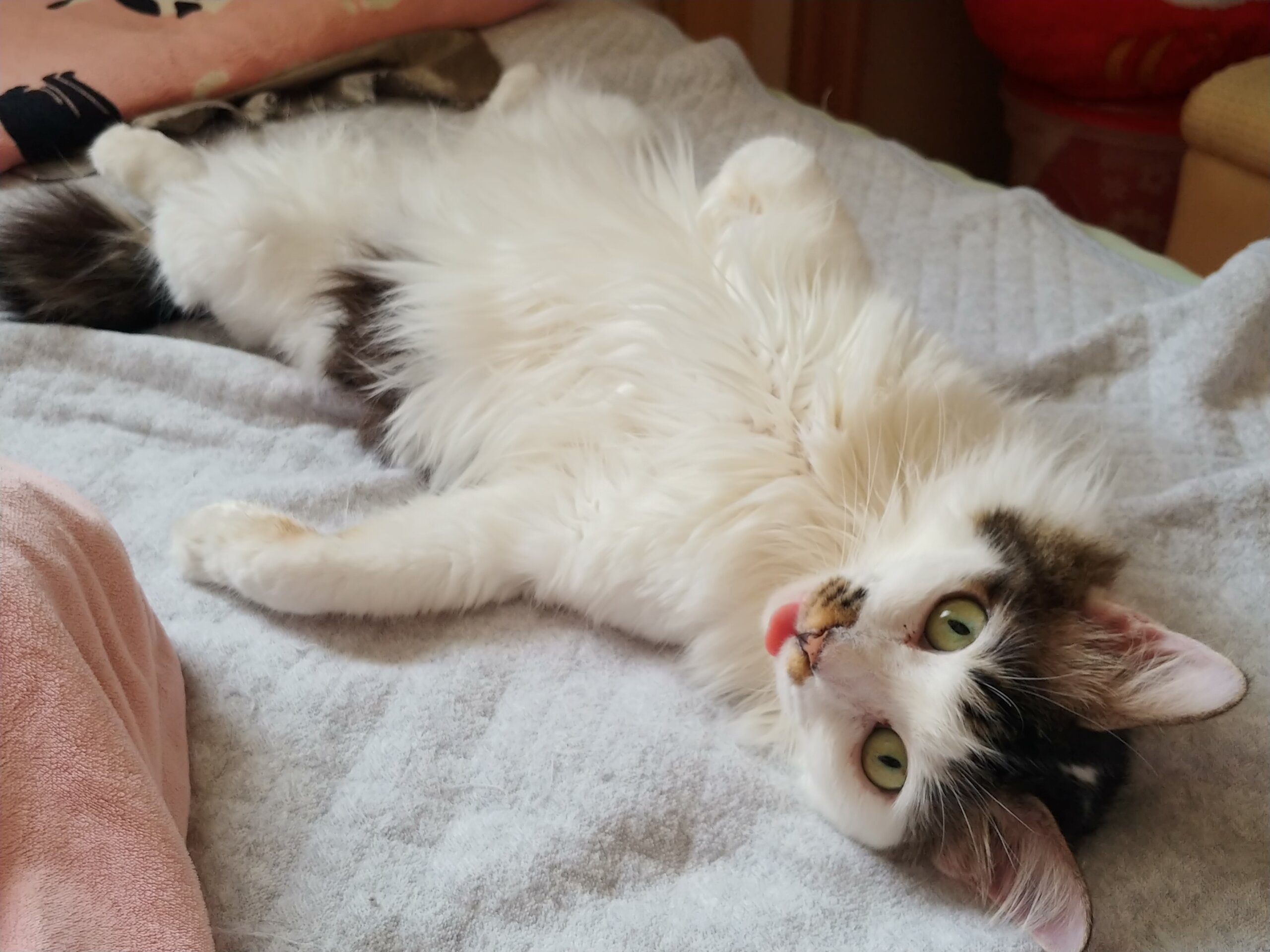 爪の損傷や体の強張りはケアし治りましたが、過酷な子猫時代のせいで口内環境が荒れており、牙が1本抜けてます。