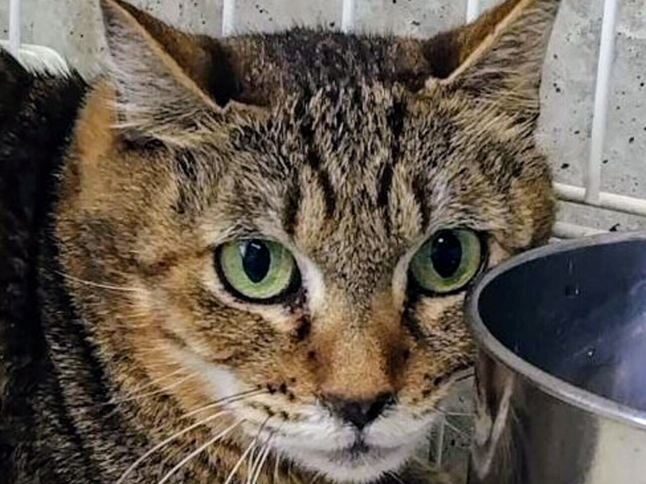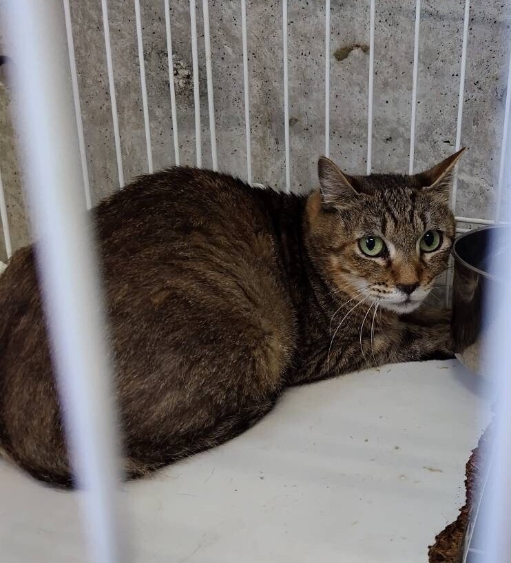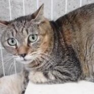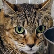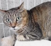 細目で白いマズルが特徴の美人のキジトラの女の子です。